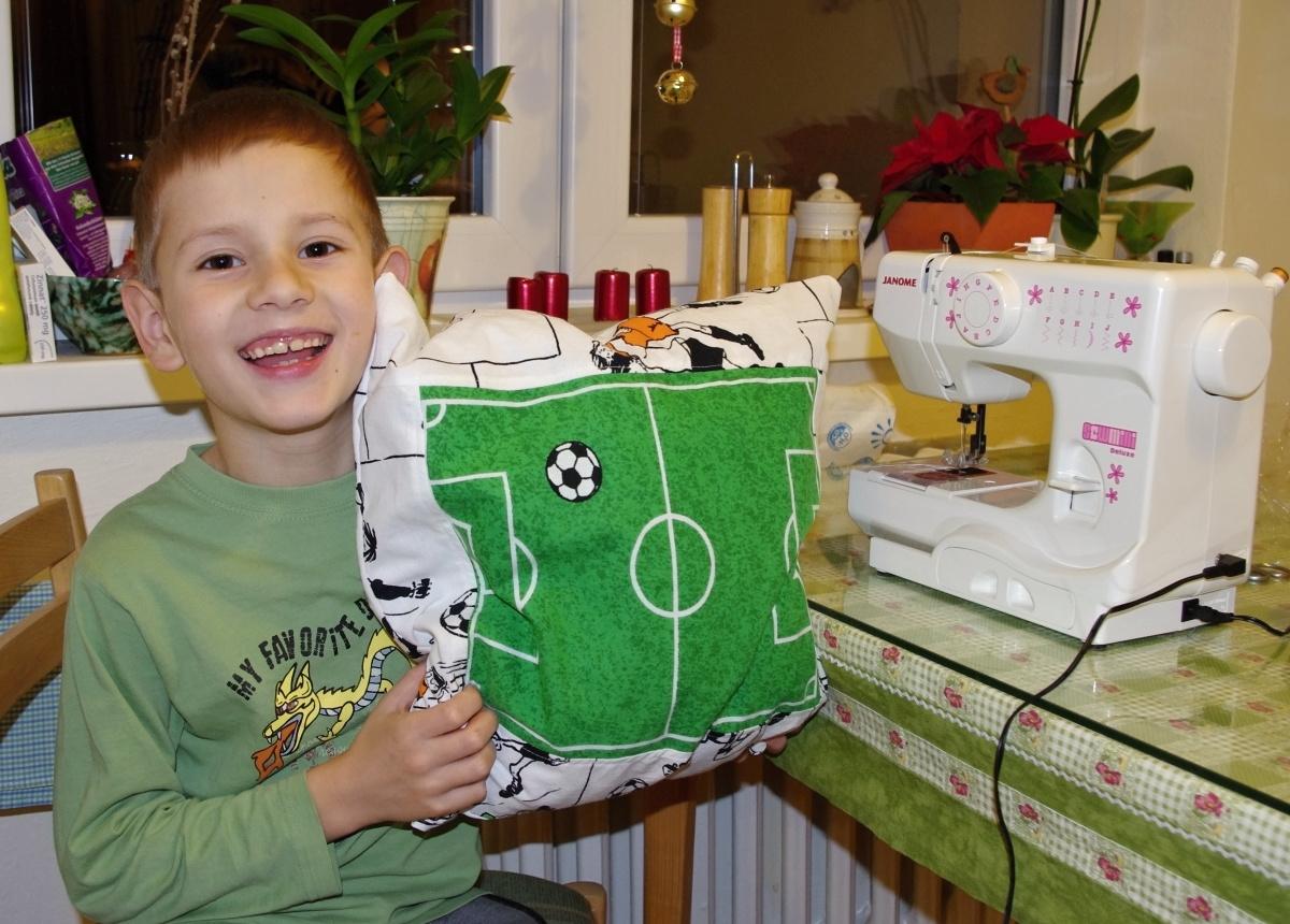 Dnes odpoledne jsem si konečně našla čas na staršího synka a pomohla mu ušít jeho vysněný povlak na polštářek. Není to nic světoborného, ale oba máme velkou radost. Já radila, hlídala, aby se neřízl řezákem a aby byly švy rovné, 90% práce je jeho. Kdo ví, jestli se mu někdy základy šití nebudou hodit🙂