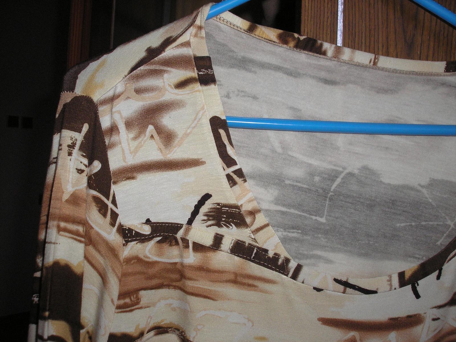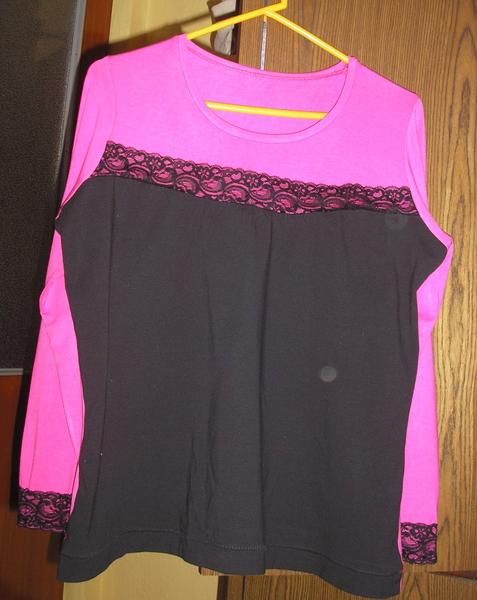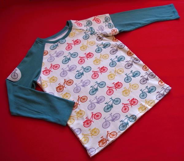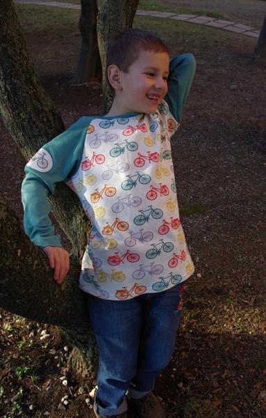Včera večer jsem ušila synkovi tričko, dnes jsme zvládli i nafotit. Jednobarevný úplet jsem vzala z vyřazeného trička po mamce, se mi začíná tahle recyklace líbit. Nesourodost rukávů je schválně, částečně i kvůli tomu, že přední díl starého trička měl dost velký výstřih a druhý celý rukáv by nevyšel. Raglán jsem šila poprvé, fakt sedí tomu mému hubeňourovi hezky (už tu kdosi psal, že hubeným dětem dobře sedí) a dobře se i šije. Synek spokojený🙂