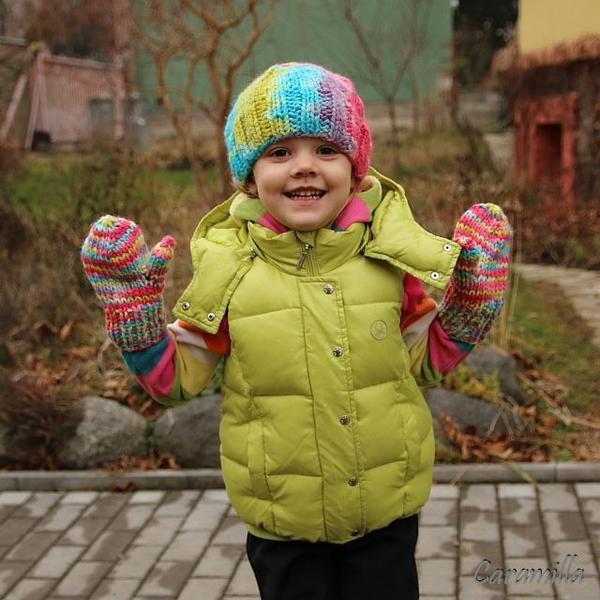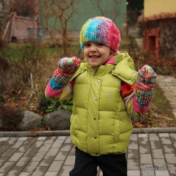 @caramilla palčáky jsem už obdivovala na blogu, fakt krásně povedené barvení, takové hezky jasné. A kolik že máte vlastně těch vestiček a bundiček 🙂 Super je ta čepka, že ji natočíš, dle barvy oblečení 😉