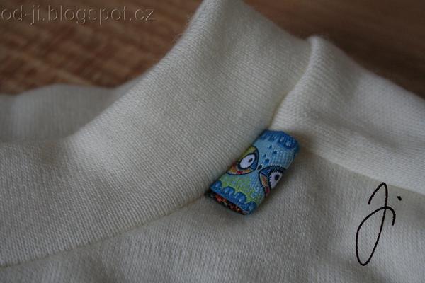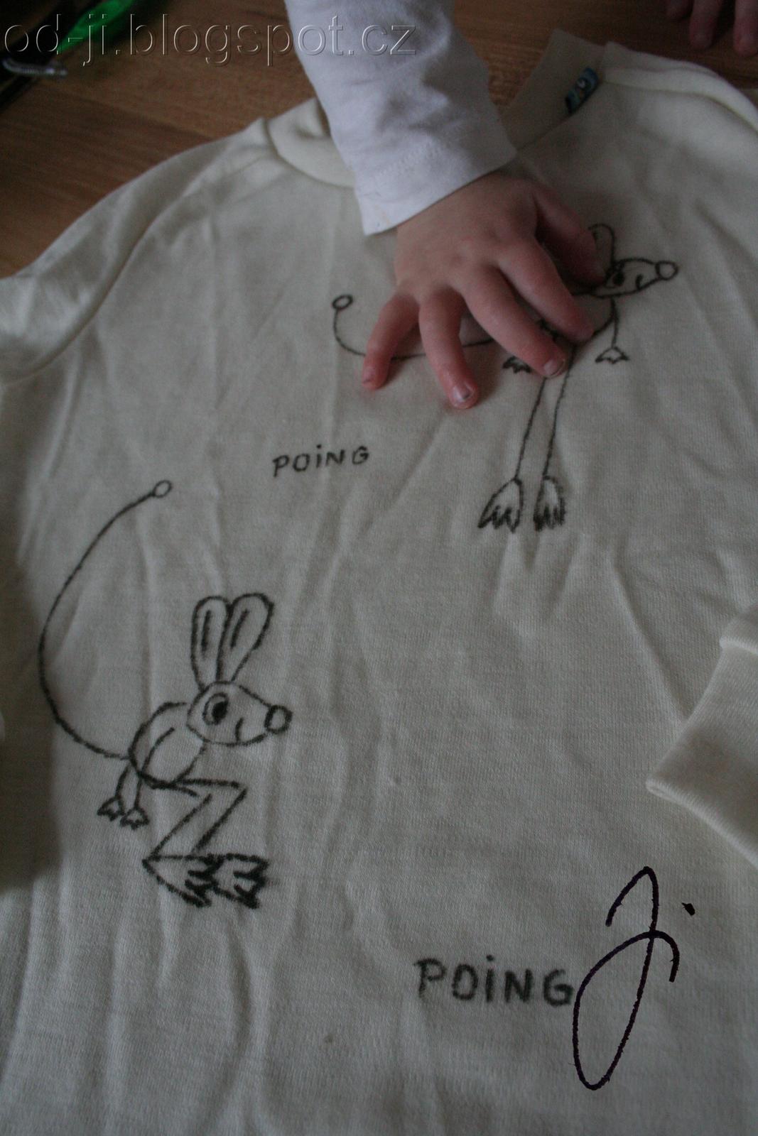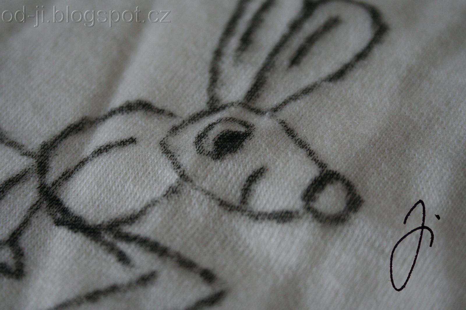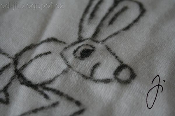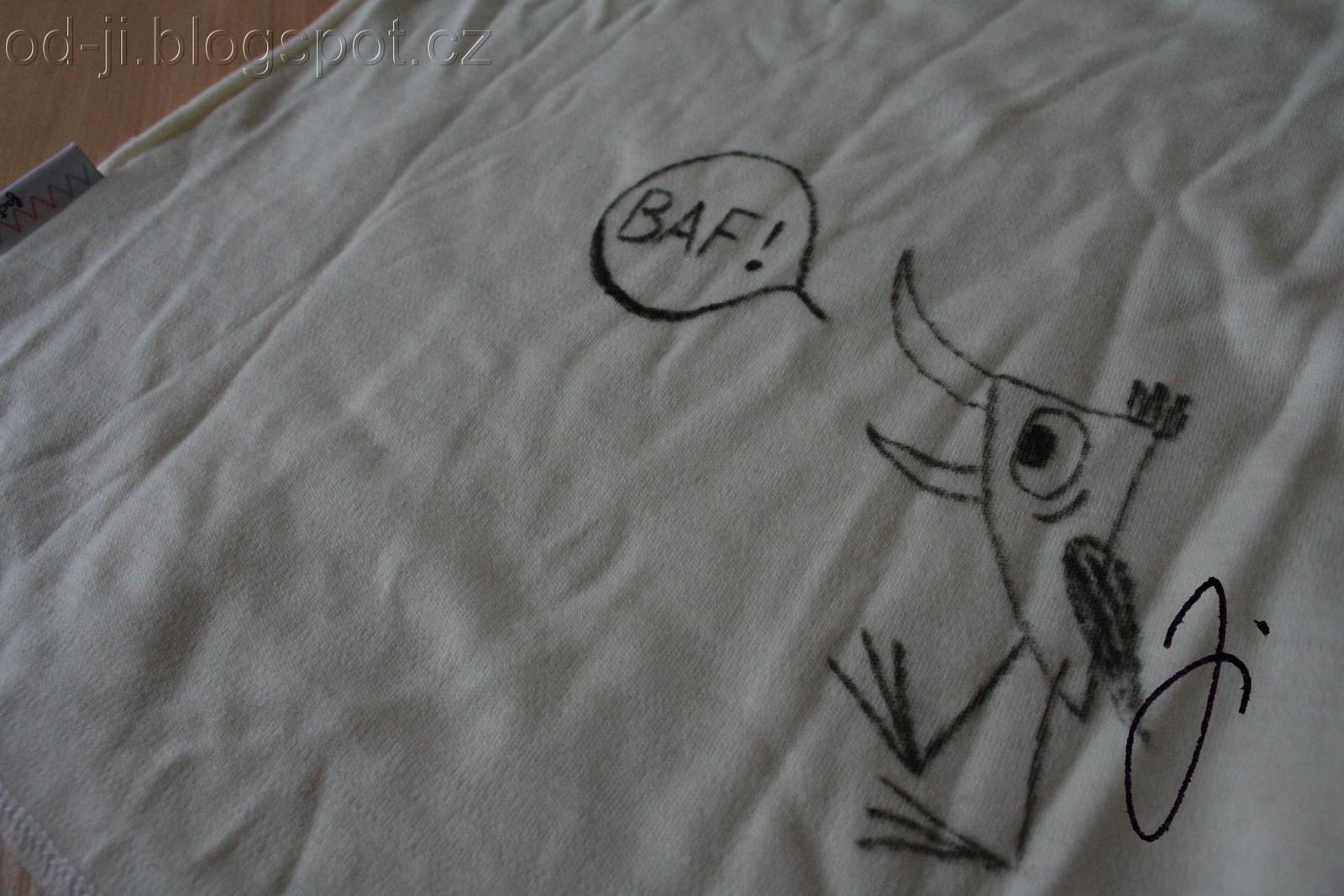 Bílá by byla pro moje zmlsaný děti málo, tak jsem fixkou nakreslila tarbíky Týnu a Toma. V zadu dělá maličkatý marabu BAF. Toník je odmítal vysvléct...jak málo stačí k dětské radosti 🙂 Kreslilo se to docela blbě merino, pod fixkou mi tu utíkalo... ale dalo se to.