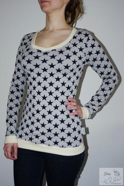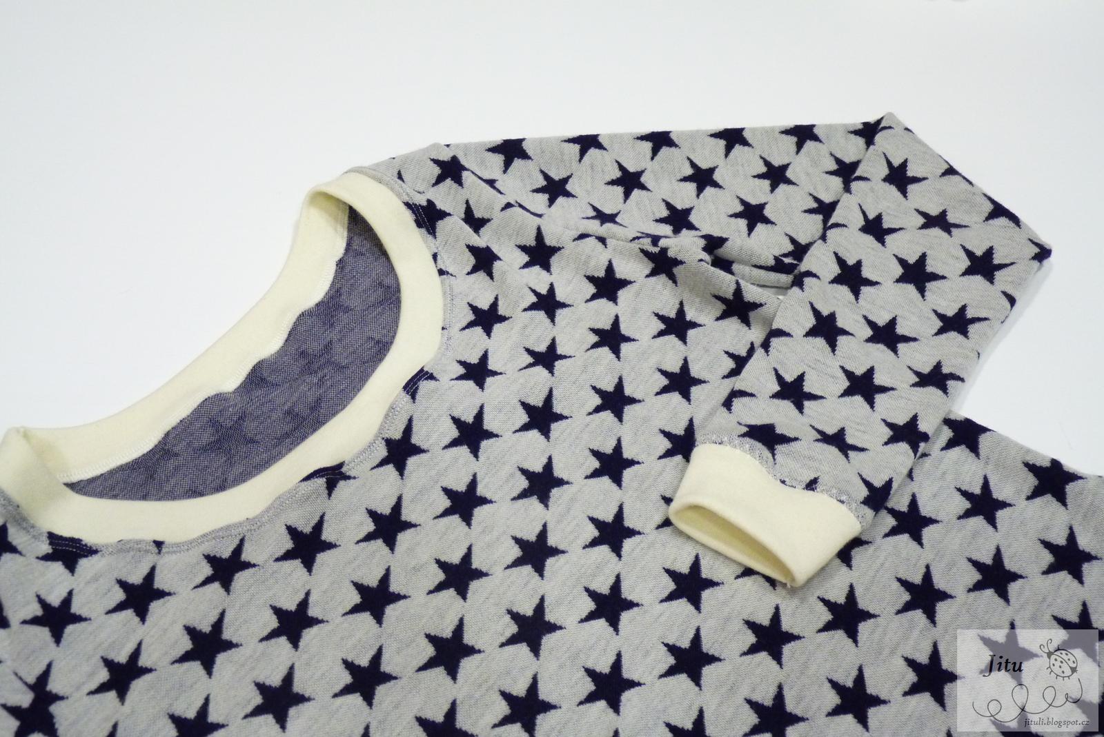 Jsou to ty fialové hvězdy z Mylly, v reálu trochu tmavší než na obrázcích, ale neuvěřitelně příjemné. KOupil ajsem si je k narozeninám, co budu mít v únoru. Prošití lemů se trochu zvlnilo, na těle t naštěstí není moc vidět. Ale příští trik už bude dokonalé, k 30 dostanu coverlock 🙂