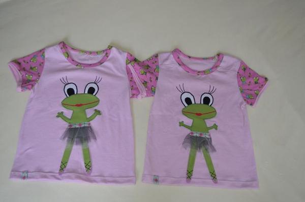 tento týden jsem si potřebovala vyčistit hlavu, takže jsem zvolila terapii u stroje. Sice nevím, jestli je blahodárné, že mám díky tomu kruhy pod očima 😀 😀 😀 , ale trička se starší dceři líbily 🙂. Ty růžové jsou stejná velikost, jen je to focené pod úhlem a jedno vypadá menší. Modré je pro syna. Nohy žábám volně visí, na fotce to není vidět.