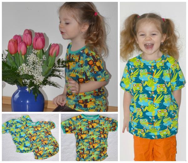 Po prvotním nezdaru jsem se zase osmělila střihnout do látek, kterým bych měla ještě nějakou dobu říkat pane a dopadlo to snad docela dobře...pravda, trika jsou jak po starším bráchovi, ale věřím, že do léta budou tak akorát, střihla jsem je moc dlouhé, takže jsou ve finále na boku řasená lastinem a není to vůbec špatné. Zejména žáby měly obrovský úspěch.