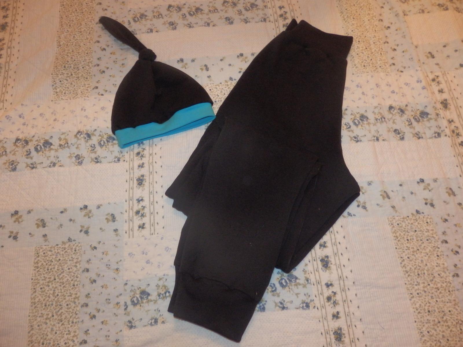 Ahoj, hazim svoje rychlovky, ala cerne teplaky bez kapes, pro meho skoro-pubertaka a cepicka pro Tobika ze zbytku teplakoviny a jeste zavinka pro Adinku 🙂
