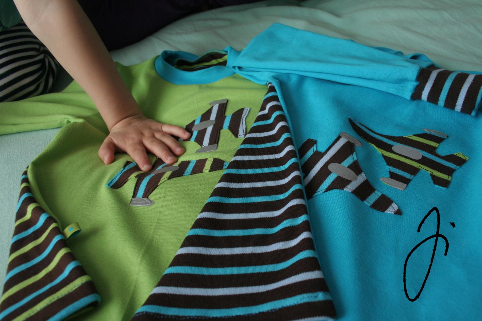 něco jsem za poslední dobu zvládla našít, jen fotit zatím moc nestíhám, tak tu je jedna kukla pro malou kamarádku a Danai pro Tondu. Vzala jsem velikost, ze které mu už vyrostly ruce a lezly záda. Prodloužila jsem jen dýlku a rukávy a stejně mi přijde, že je mu obří-divný. Nicměně hned si jí musel vzít do školky a odpoledne ji nechtěl doma svlíct. Tak máme doma taky rappera... A ještě dvě trika. Pro Toníka a jeho kamaráda. Přáli si stíhačky..