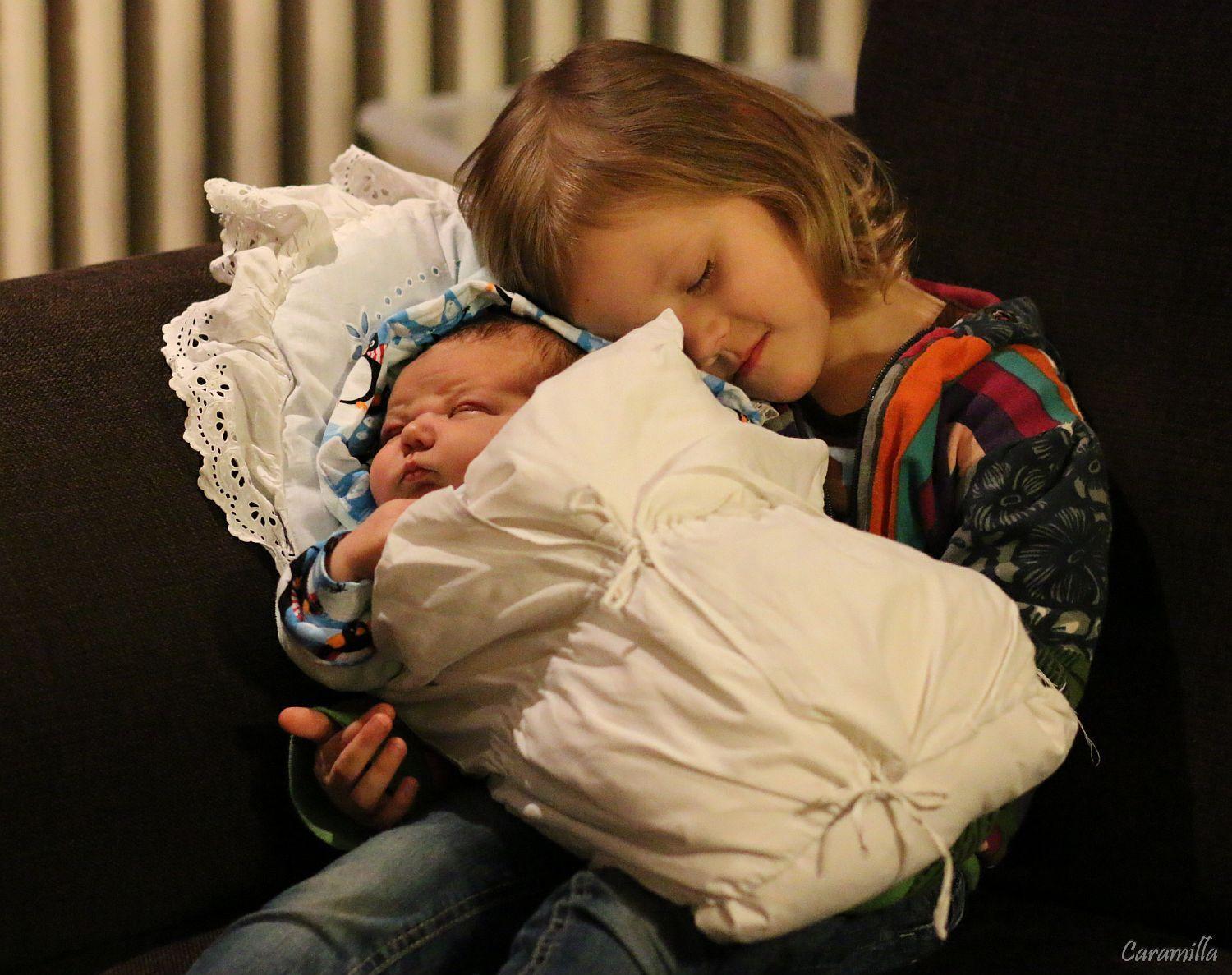 Jasmínka v porodnici byla zaražená a pak tam i nechtěla už jezdit, tak jezdil jen manžel. Dneska doma byla taky zaražená, úzkostlivá a furt pro všechno plakala, furt se po mě válela a pak po zemi a byla úplně vyřízená. Až jsem si říkala, že to prostě nedáme. Pak jsem šla spát s malým a ona si k nám vlezla, pomazlila jsem oba a ona najednou vstala, odešla si hrát do obýváku a od té doby je úplně normální, začala Kryštůfka konečně hladit, pusinkovat a chovat a už se chová dobře. Tak snad už to vstřebala, musí to pro ní být těžké.