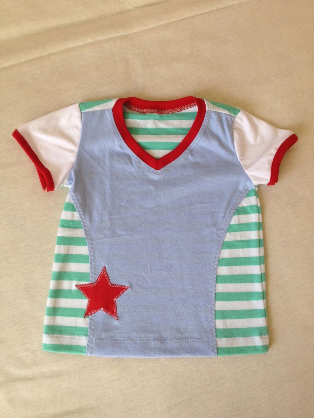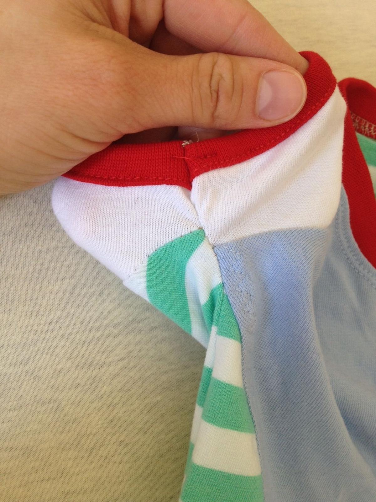 druhe tricko ok, lem se mi z vnitrni strany nepodaril tak hezky, jak jsem chtela, ale dobry, kriz paradni...a pak to dite neobliklo pres hlavu 😀 Tak jsem ten vystrih natahla, ruply v tom nejake vnitrni stehy, ale zvenku nic videt neni a pruzi to. Takze triko hezke, funkcni a muze se z dd vyradit 🙂