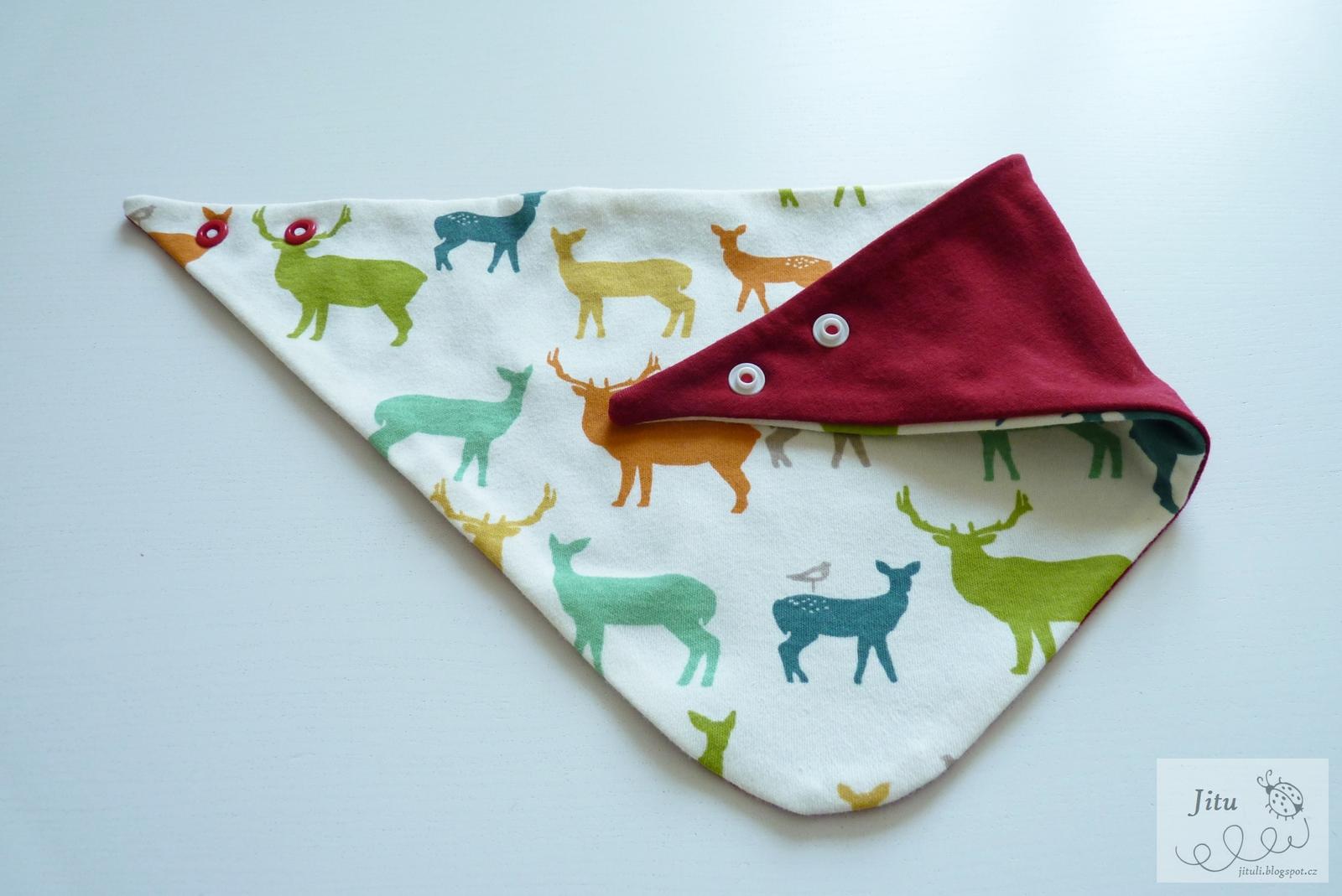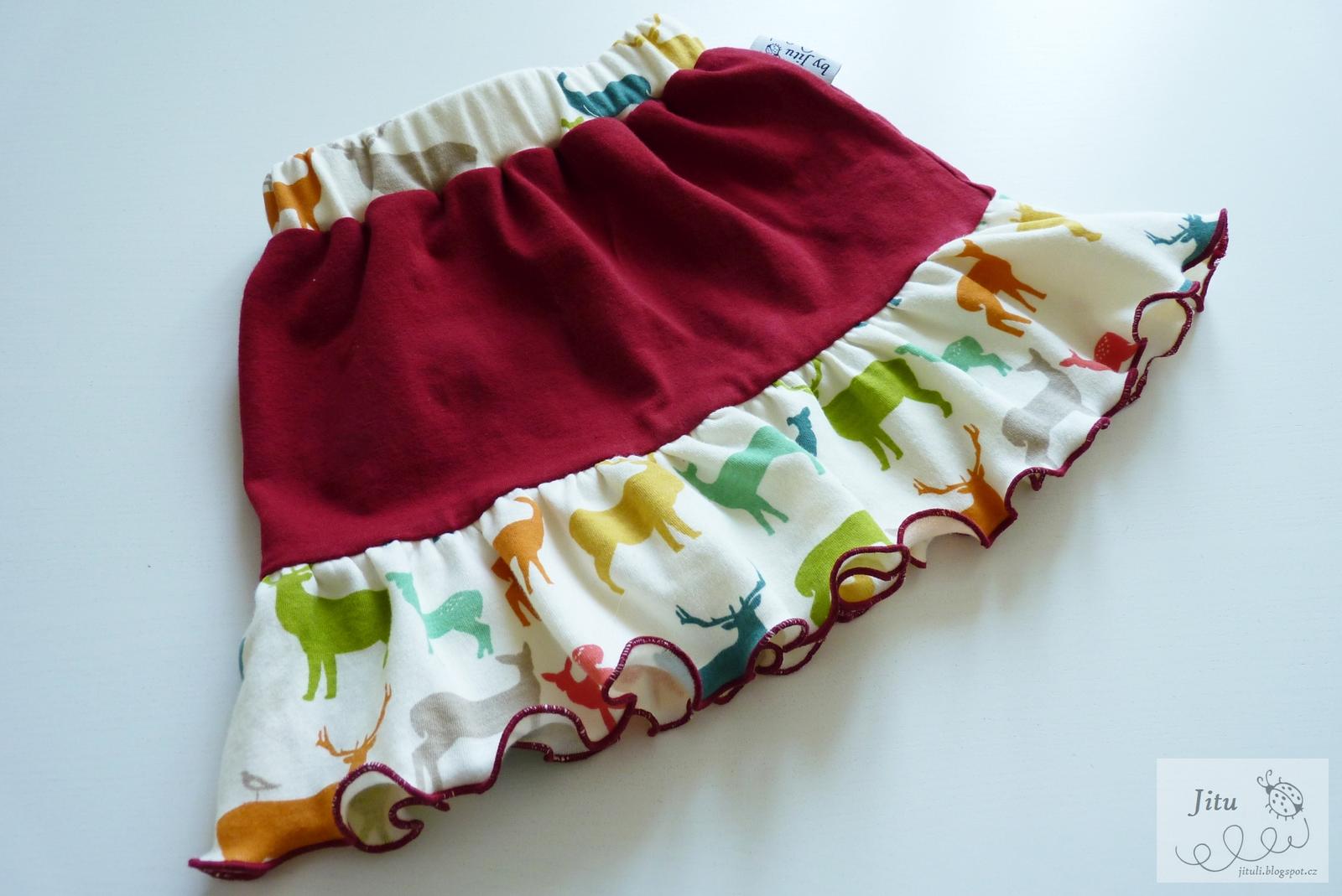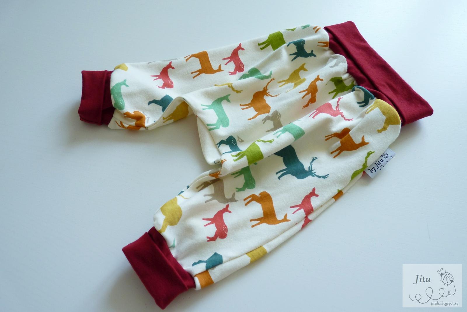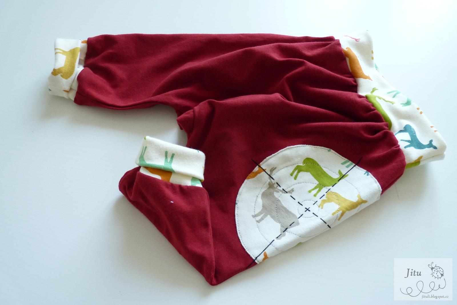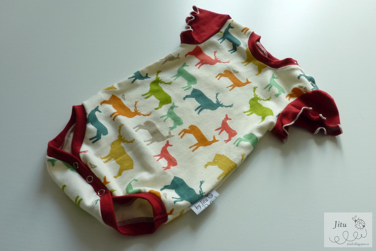 Zákaznice si přála body a slintáček a zasnila se, jak by asi vypadala sukýnka nebo tepláčky. Ta jsem se místo plínek dva večery mazlila s jeleny 🙂 S těmi červenými jsem se nedokázala rozloučit, tak ty zůstaly doma.
