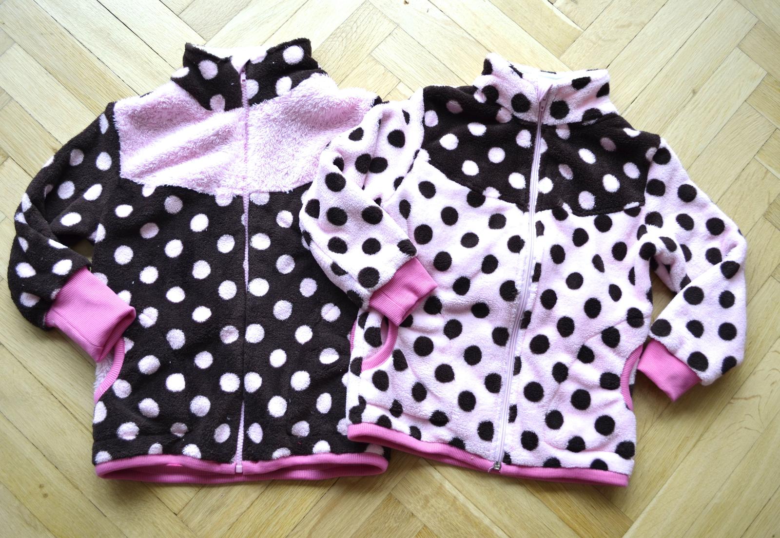 - končim s nákupama látek po půl metru, ve velikosti 110 už je to opravdu problém. Mikiny jsem došila jen díky tomu, že jsem doma vyštrachala zbytek růžové lamy, který padl přesně na předek a kapsy. Rukávy u hnědé mikiny byly krátké, ale už nebyla ani ta lama, tak mají metrové náplety 😀