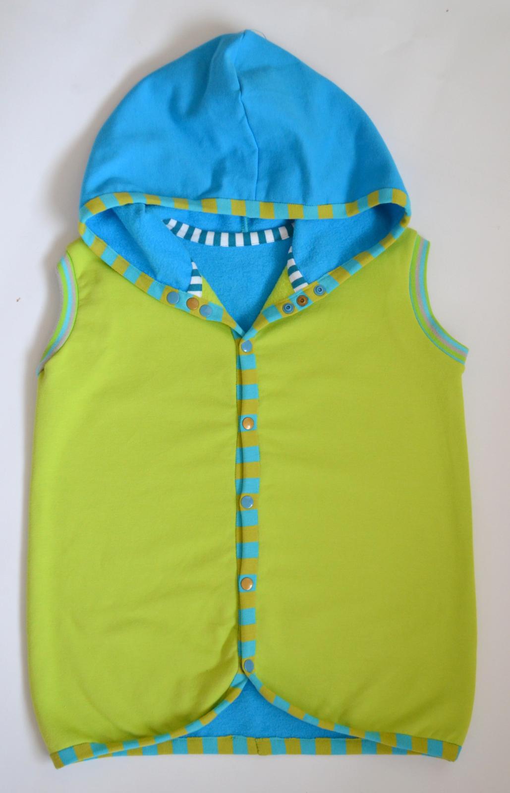 Jinak vesta je lehce dédéčková, lemy se "trochu" kroutí. Další báječný nápad byl lemovat proužkem s pruhy a přitom jej tahat, jelikož zajistit, aby na pravém i levém díle lícovaly...no zázrakem se to celkem povedlo, ale uvědomila jsem si to až záhy, že jsem to úplně nedomyslela. Dorazil to patentek, který jsem, jako "KAM patentkář amatér" narvala do švu, kde byly teplákovina a 4 úplety a samo to v tom nedrží (mám ty nejmenší patentky), takže knoflíček je nefunkční, pouze jako dekorace. A jak tak koukám na tu volnou zelenkavou plochu, tušíc, že zelenkavá dlouho nezůstane, jdu vymyslet, jaká by se ujala aplikace nebo aspoň kapsa 😉 .