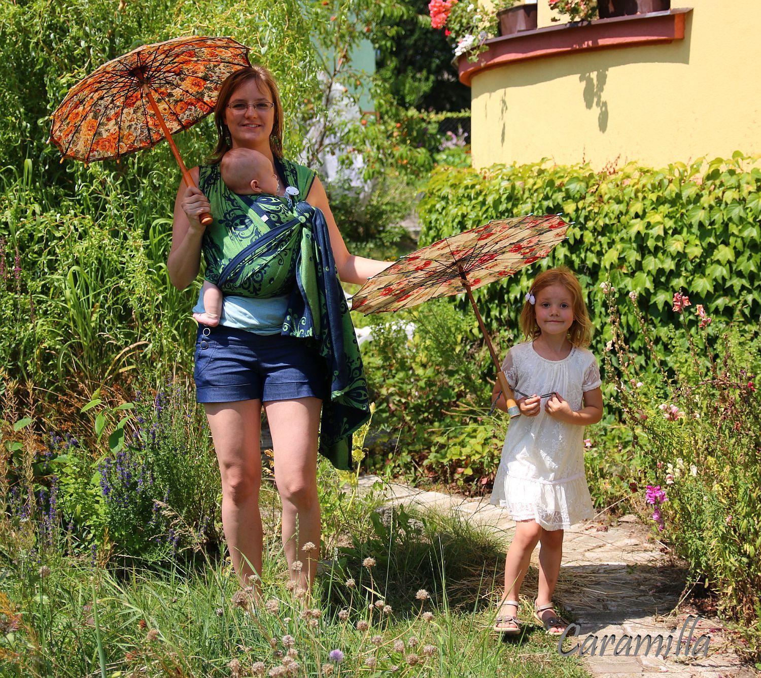 @kuna s těma šatičkama je to přesný, no. Já jsem Jasmíně koupila na MMB za 20 Kč tričko oprané, široké, hnusné s aplikací motýla, aby měla do školky a na zničení a ona mi ho chce nosit furt, i do kostela, i ve vedru. A to je hnusné, fakt to nechápu, neni ani růžové, je zelené, ale zelená je asi jediná barva, co bere kromě růžové a fialové na milost 😝 Ale dneska teda měla smetanové šaty a strašně jí slušely. (Takhle jsme šli dnes do kostela🙂 Šátek + slunečník je mnohem lepší než kočár. Mám pocit, že jak já se potím a tím nás oba ochlazuju, tak to vedro snesl mnohem lépe než v kočáře, ani nebyl přehřátý... A Nelumbo teda do veder fakt super šátek.