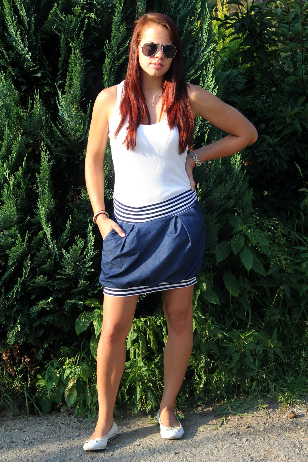tak y vám sem lupnu sukni s příběhem, která vznikla úplně náhodou a teď je z ní hit. Šila jsem zákaznici celoriflovou balónovku a střihla jí z látky kterou jsem si nezměřila ,měla užší šíři a když jsem šla skládat protizáhyby ,tak jsem zjistila ,že to mám malé. 😠 😠 No náležitě jsem zanadávala a střihla jsem novou. Zůstalo mi zde torzo s kapsama a bylo mi to líto, tak jsem k ní lupla proužek a je dokonalá , dcera se do ní zamilovala 🙂 🙂 🙂 ,a hlavně jí k tomu ladí tričko a tenisky Convers co si přivezla s Egypta. No nejlepší věci vzniknou náhodou