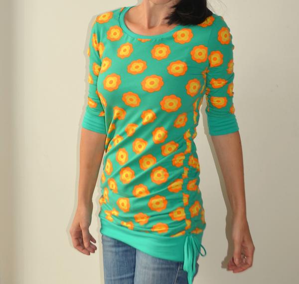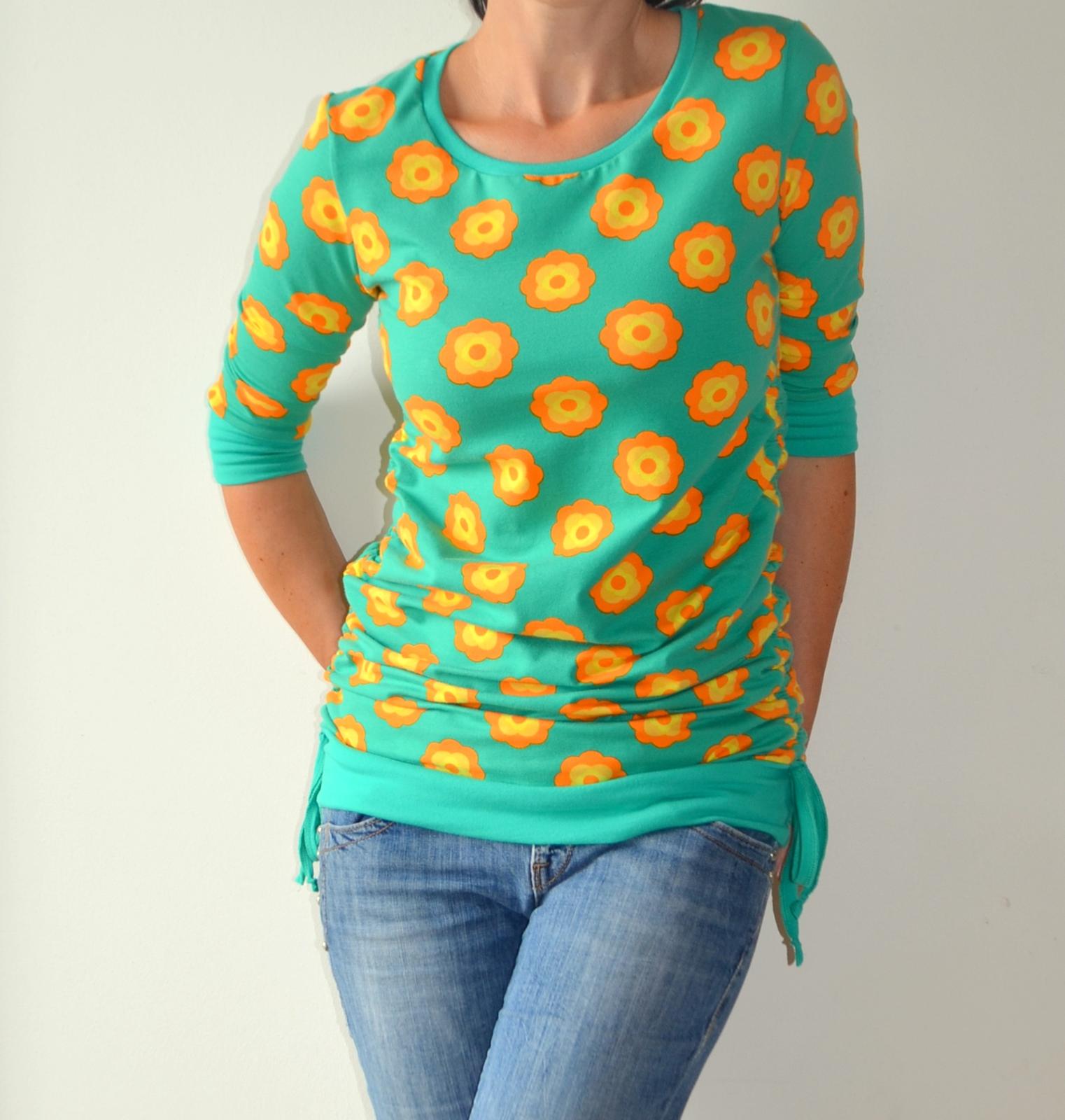@kamishek jo děvucho, je to alchymie 😝. Šňůrka je šitá, normoš ustřižený tenoučký proužek a sešitý k sobě. K tričku je všitý do podpaždí, protažený tunelem až dolů a přichycený k lemu a ustřižený. Dále jsou k lemu přichycené zevnitř směrem ven dvě šňůrky a svázané do mašličky (tudíž jsou falešné, délka trika je daná napevno). Dá se to udělat tak, že nedáš dolů patent, ale uděláš normálně dýlku a navíc si můžeš regulovat to stahování na boku, ale vzhledem k tomu, že nemám COL, tak jsem to chtěla udělat tak, aby to bylo plně funkční a dobře sedělo, asi bych ten lem dvojjehlou nebo nějakým cikcakem dobře neudělala, takže proto tohle řešení. Inspirací mi bylo staré triko z HM.