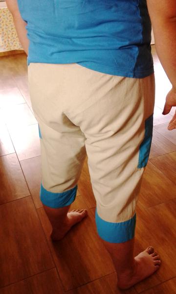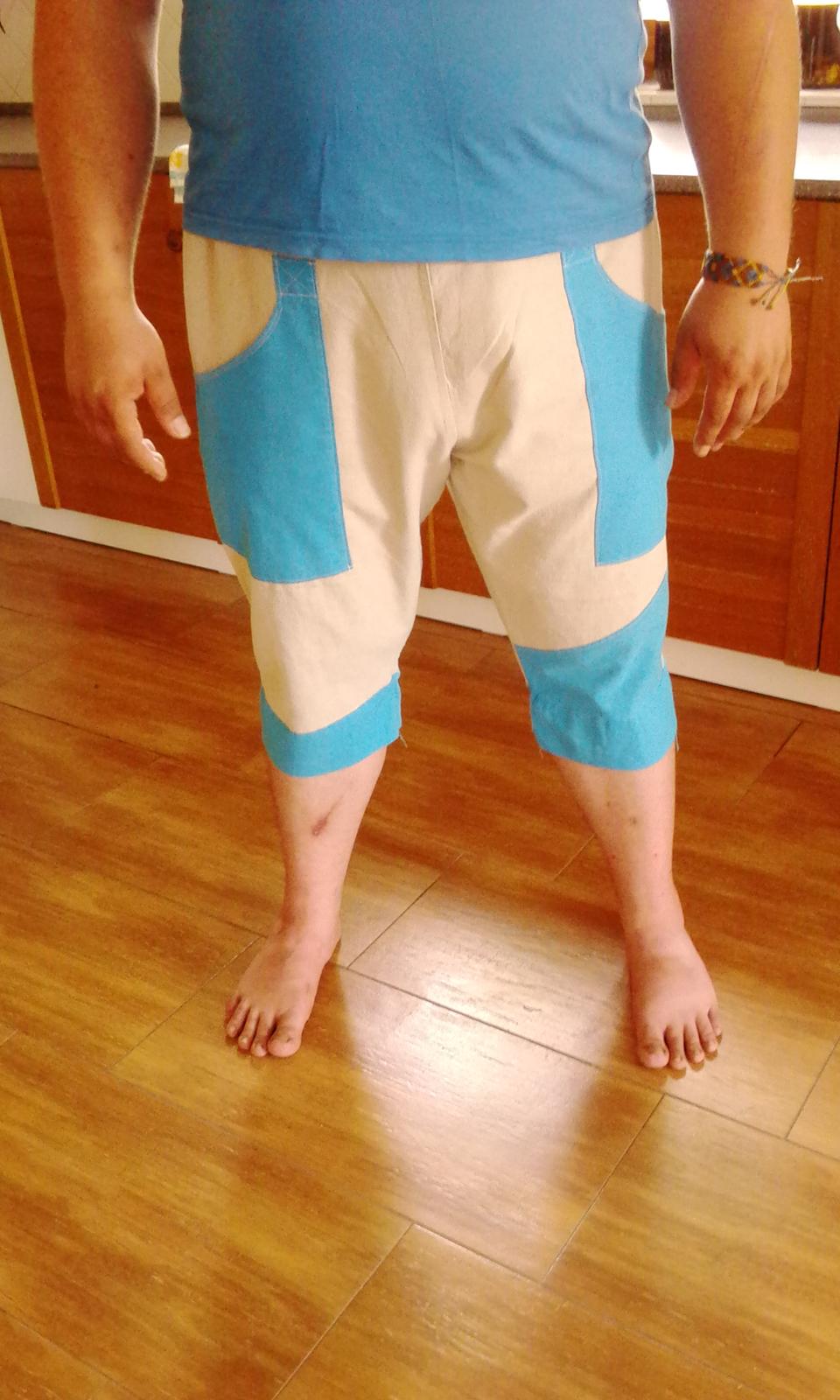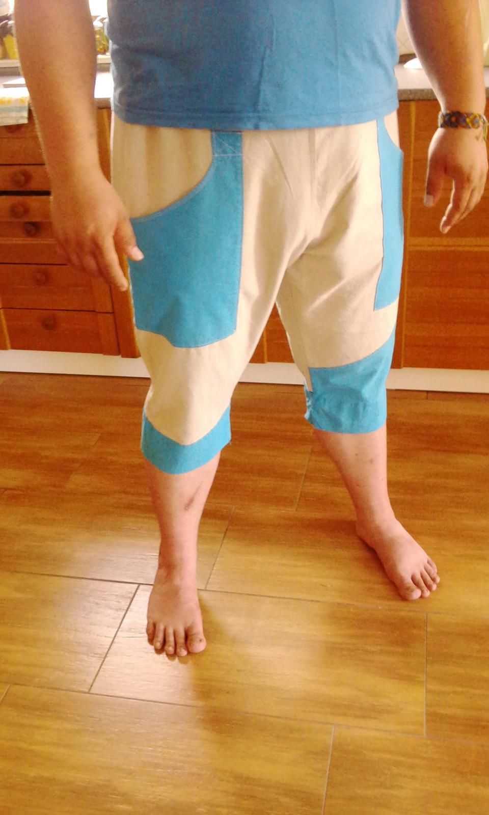 Jelikož je to všechno se mnou na dlouhé lokte, tak u většiny věcí trvá zhotovení déle než měsíc 😀 v červnu jsem se rozhodla, že ušiju muži bermudy na léto, v červenci zkonstruovala střih, v srpnu nastříhala látku a v září ušila 🙂 Konstruovala jsem kalhoty "dle Müllera", podle už hotového střihu z Burdy jsem přidala kapsy a dvojitý pruh okolo nohavic (dole). Fotky jsou z mobilu, takže kvalita nula, nula nic...