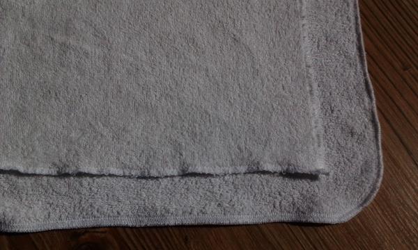 První dítě jsem chtěla látkovat (nakonec to nevyšlo, ale to je jiná), nechala jsem si tedy u švadleny obroubit bambusové froté (jakože čtvercovky), sama jsem ještě overlock neměla. Paní to obroubila, vrátila mi to a říkala, že to líp prostě nejde, že se to tahá a že to byla hrozná práce. Teď jsem je na druhátko vytáhla a říkala jsem si, že to zkusím sama. No posuďte "profi" práci: (plínku s kulatým okrajem jsem obrubovala já) - a to jsem pro srovnání ty nejhorší už předělala, nenapadlo mě je vyfotit hned.