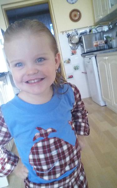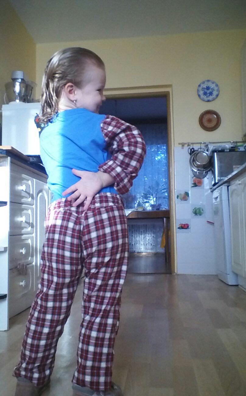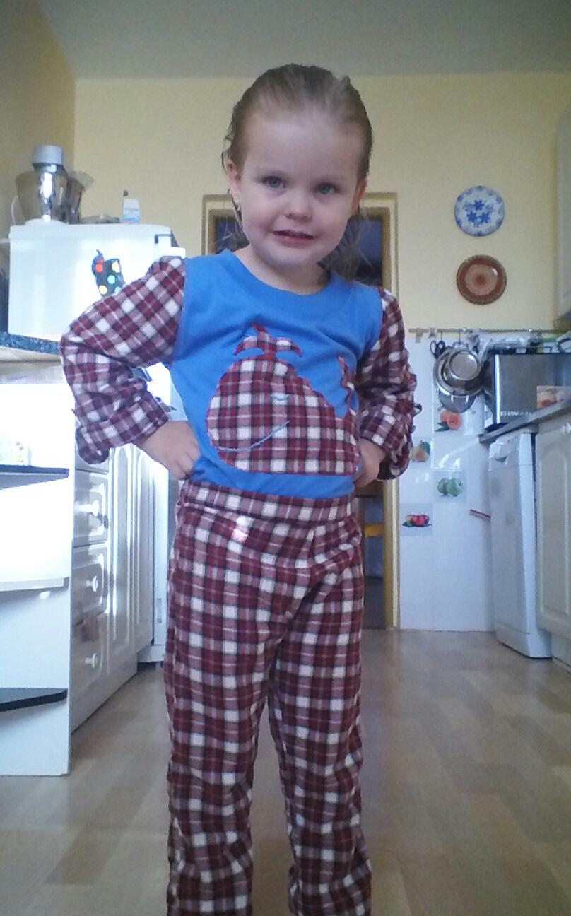 Tak som len a len kvoli vam nahnala dieta do vane uz o piatej, aby som ju mohla odfotit narychlo v recy pyzame aspon, ked to tak vyzera, ze fotenie cistych vyzehlenych veci nebude tak skoro 😀 (ze vyzehlenyyych hahaaaaa ) Zmova som podvadzala a limec som nechala povodny, z original tricka, lebo sa mi s tym nechcelo prplat 😕 Site ako z nudze cnost, lebo chladne noci sa tu zrazu zjavili ako na zahori tacky a moje dieta cislo jeden sa vrti v posteli ako kolotoc, este aj nocne kosele mava zrolovane pod pazuchami a vsetko ostatne hole... takze tento vrch je ako body pre babatka, ide az pod zadok a zapina sa vpredu dole na dva cvoky, aby si to vedela aj sama rozopnut ked treba ist cikat. Snad to bude stacit a krize ostanu zakryte! 🙄 Aplikacia zakryva reklamny napis na original tricku 😀 😀 😀