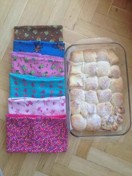 No melo me trknout to, ze koki psala, ze si pekla na vlastni svatbu. Na fotce je jasne videt, ktere buchty jsou ty prvni. A u nakrcniku jsem si pro zmenu nevyzkousela nepruznost lamy ve srovnani s fleecem, takze ty chlupate musim presivat, deti je nenarvou pres hlavu.