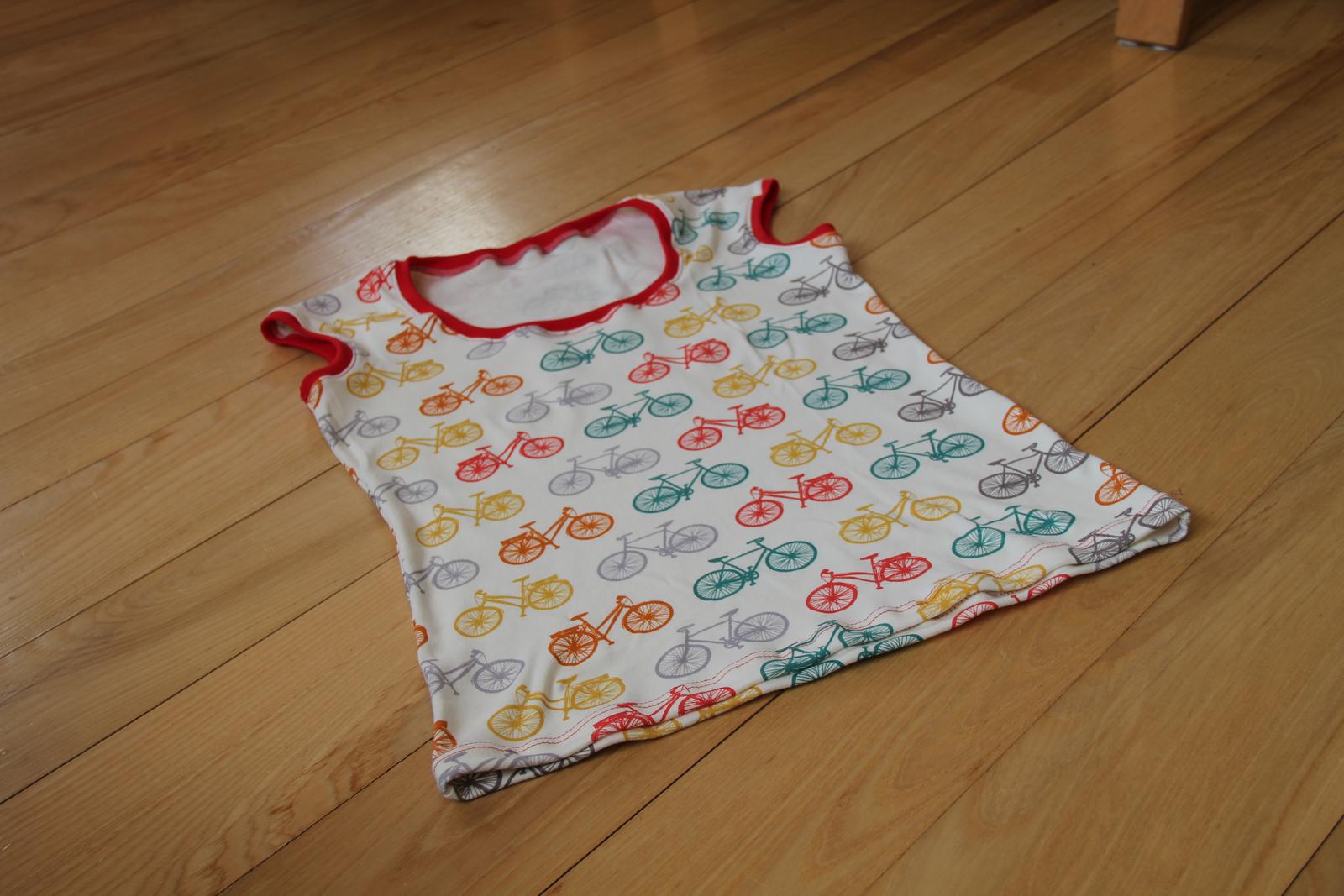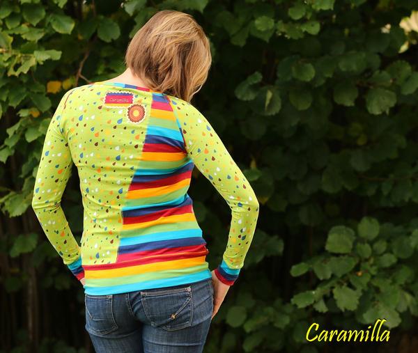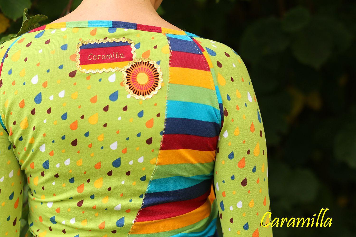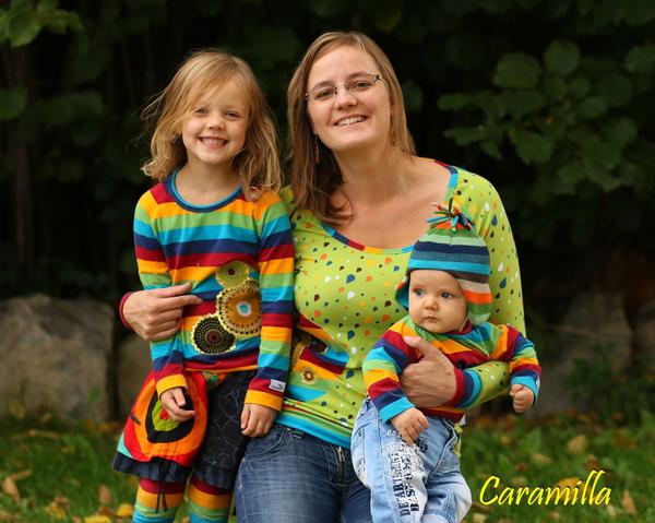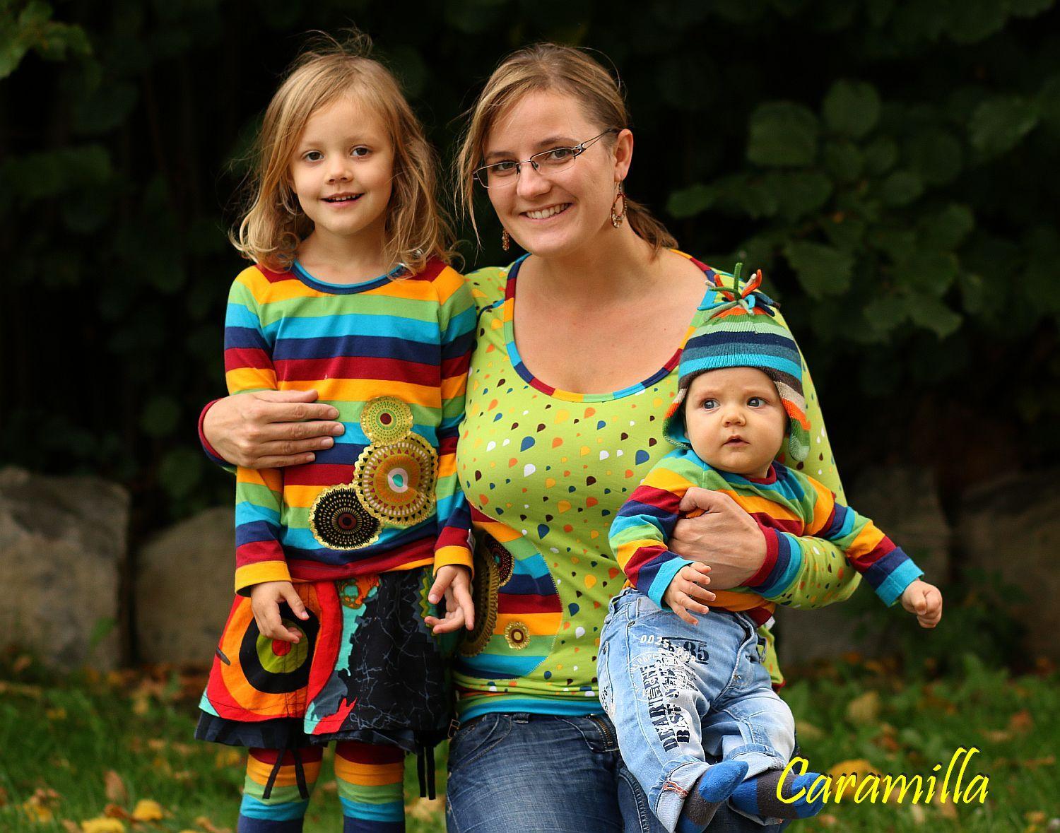 Tak jsme obšití už všichni - Mum and me ala proužky... ale teda s.aní s tím bylo hafo, triko jsem několikrát párala, několikrát blbě ušmikla některý díl, no děs... největší debilita byla, že jsem ho celé ušila a zjistila jsem, že jsem si nepohlídala proužky, takže na boku nenavazovaly (při střihání mi to krávě vůbec nedošlo). No, tak celé rozpárat, ustřihnout nové proužky, znova sešít, abych viděla, že s diferenciálem se tyhle pruhy nějak asi nedají sešít, tak jsem to nakonec párala 3x a počtvrté už stehovala a sešila prve na rovnostehu. Děs a hrůza, ale jinak to tričko už teď miluju a budu nosit ráda 😵 /Křivě našitá cedulka vzadu je samozřejmě záměr, aby to bylo "origo" že 😝 /