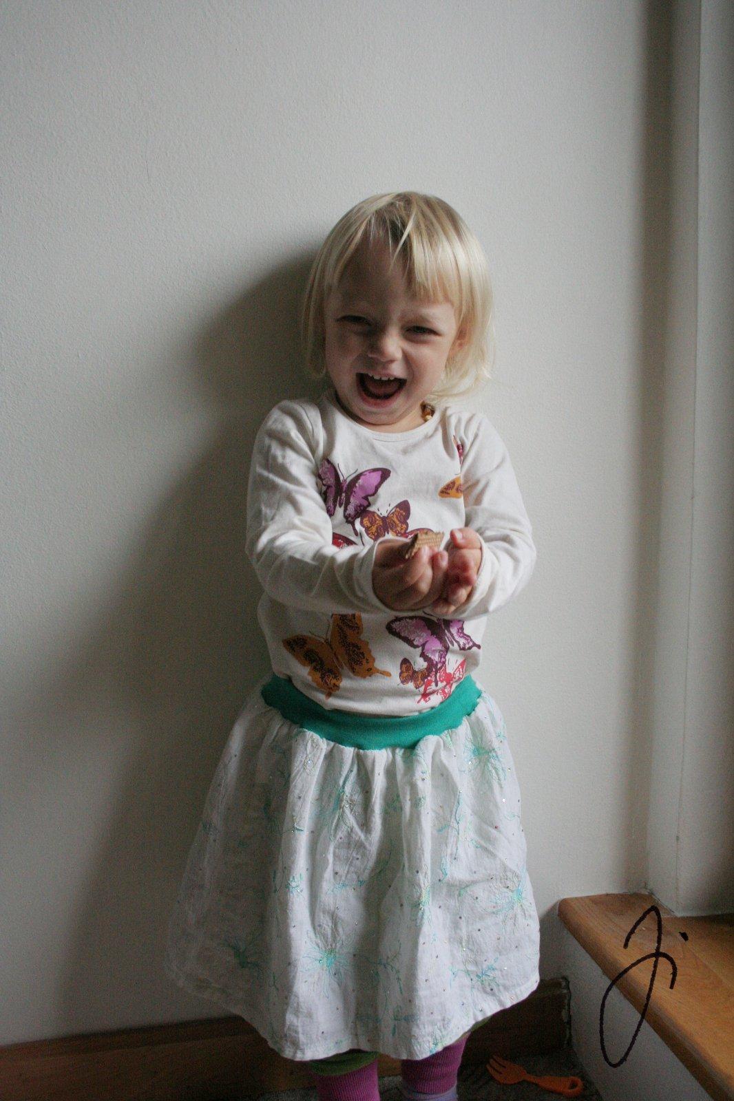 a málem bych zapomněla na "veledílo" - sukýnku z mého nenošeného tílka. V té by Kristý i spala, a kdyby si do ní dneska neprostřihla pořádnou díru, nosí jí doteď - předpokládám, že rychlost zašívání díry bude delší než rychlost ušití sukýnky!
