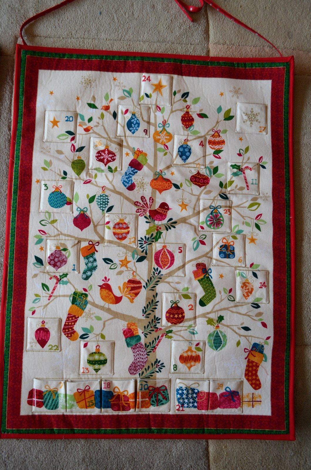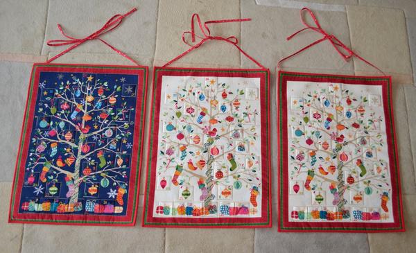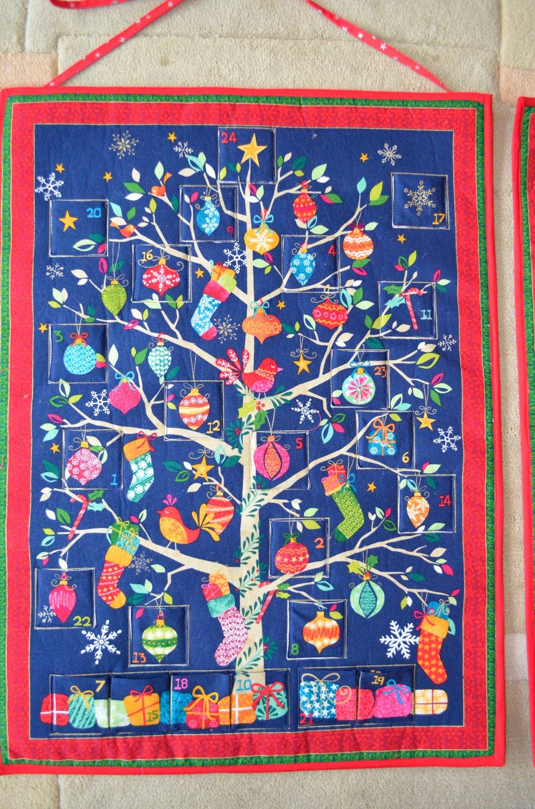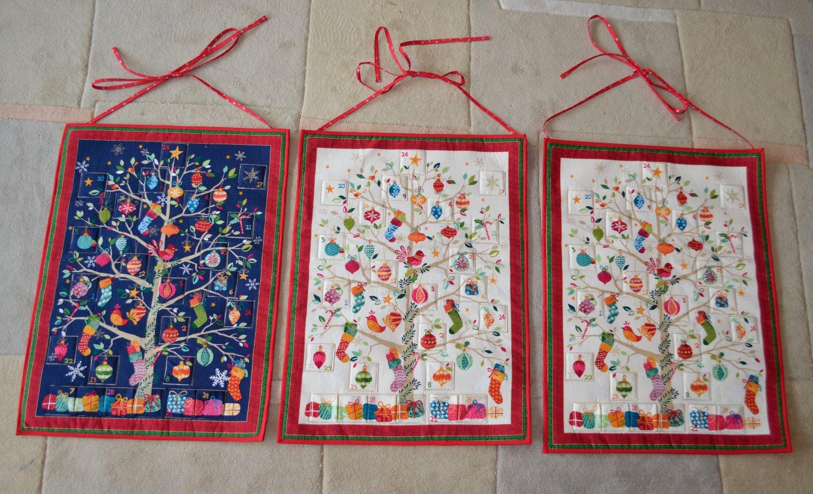 aby to nevypadalo, že se paní kuna jen fláká, tak mám tři kalendáře. Chyb asi tak milion, hlavně, když si debilně podložím všechny kapsičky světlou látkou a až mám podšito, tak si uvědomím, že na ten tmavý kalendář to fakt není ono...(naštěstí jsem si toho všimla, než jsem udělala tu spodní řadu, tak aspoň že tak). Lemování snad Mikuláš moc podrobně zkoumat nebude 😀.