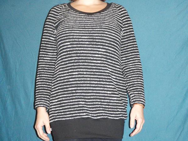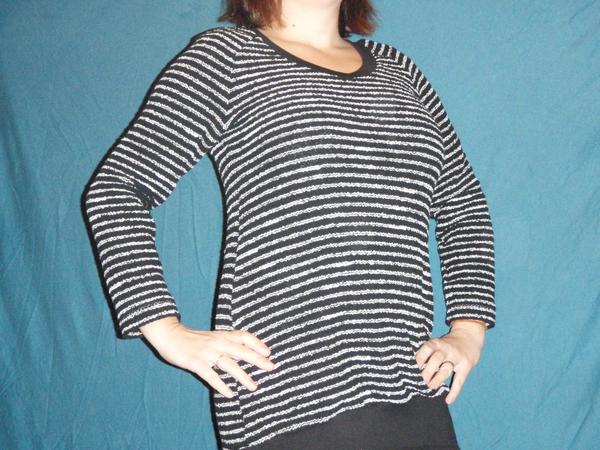 Pruhovana latka je bavlna, tkana, neco jako bukle, prijemna i na hole telo, tak je z ni pulovr. Prvni strihany podle kupovaneho byl asi o ctyri velikosti vetsi, tak jsem strihla druhy zase podle stejneho strihu. Delka pod zadek k leginam. Zase ulovek z Flex-texu, 29,-/m, uvidim, co s tim udela prani...