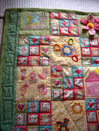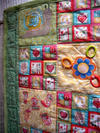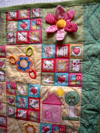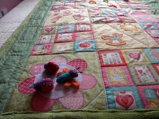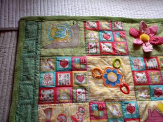 Tak som to nakoniec dosila a prikladam foto presivanej hracej deky s roznymi aktivitami. Vzhladom k casovej tiesni som spokojna... 😀 mozno ak by som mala viac casu, tak nieco urobim inak, ale aspon ju mame. Zo spodu je flis koli lepsej termoizolacii na drevenu podlahu v dome. Kvietok ma sustave lupene a piskaci stredok, velky kvietok ma stredok zo sucheho zispu, cize tie motyle sa daju odobrat a premiestnit. 🙂