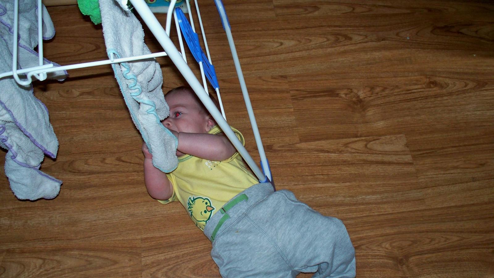 cez den sme dnes boli na nahaca prikryty malym uteracikom (pre pripad nehody, horsie je, ze uz si ho dava do ust 😀) a max. som mu davala stvorec so snappi sponkou bez vrchnych nohaviciek a menila som to hned ako nacikal.