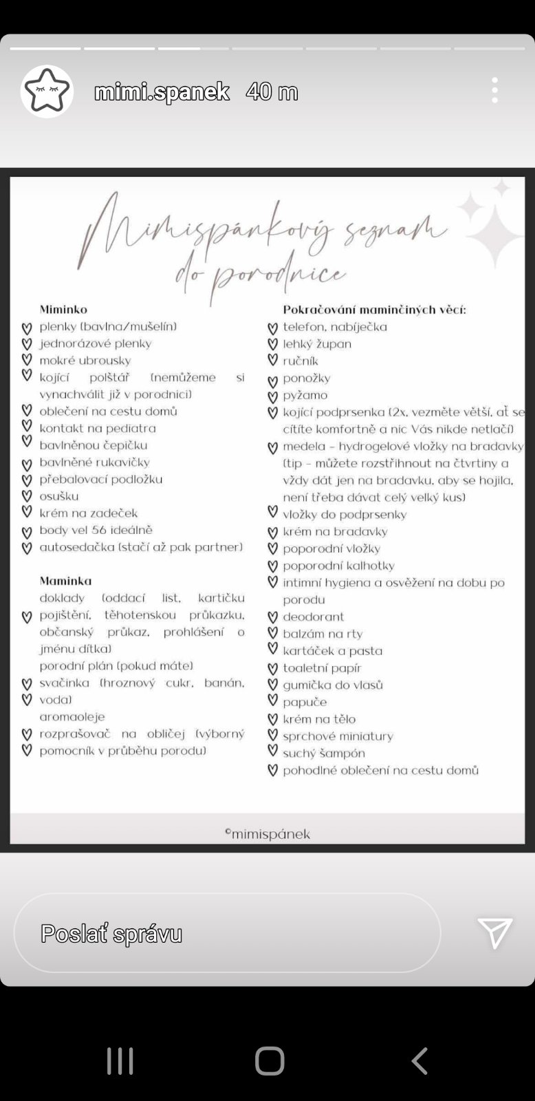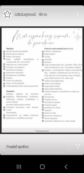 a okrem standardneho zoznamu pre mna som si brala este hroznovu stavu, senovku a benedikt na podporu laktacie, pribor vratane malej lyzicky a pohar, podlozky a vlozky jedno balenie, jednorazove nohavicky, poporodny vankus a cicatridina sprej, mne sa na poporodne zranenia hodil 🙂