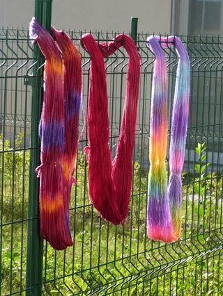 @janickabez Ono to slunko už nemělo moc sílu... Barvy jsou Jacquard tyto -- http://www.art-creative.cz/praskova-barviva-bat..., klasická metoda naplácat na přadeno (předem namočené v kyselé vodě s trochou šamponu), zavinout do fólie, dát do mikrovlnky aby se to začlo "vařit". Místo octa dávám kys. citronovou, nesmrdí.
