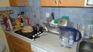 První místo - trumfne mě někdo??? A tohle ještě není nejhorší stav v kuchyni. A taky na svoji obhajobu říkám, že ji většinou každý den uklízím! Kuchyň mám velkou a přesto je všude bordel. Myčku mám, ale ruce, co by ji vyndavaly a nandavaly nemám. Resp. teda mám, ale Jasmí to nosí po celym bytě, takže se pak ještě zakopává o talíčři misky a při našlápnutí vystřelují lžíce a vidličky 😀