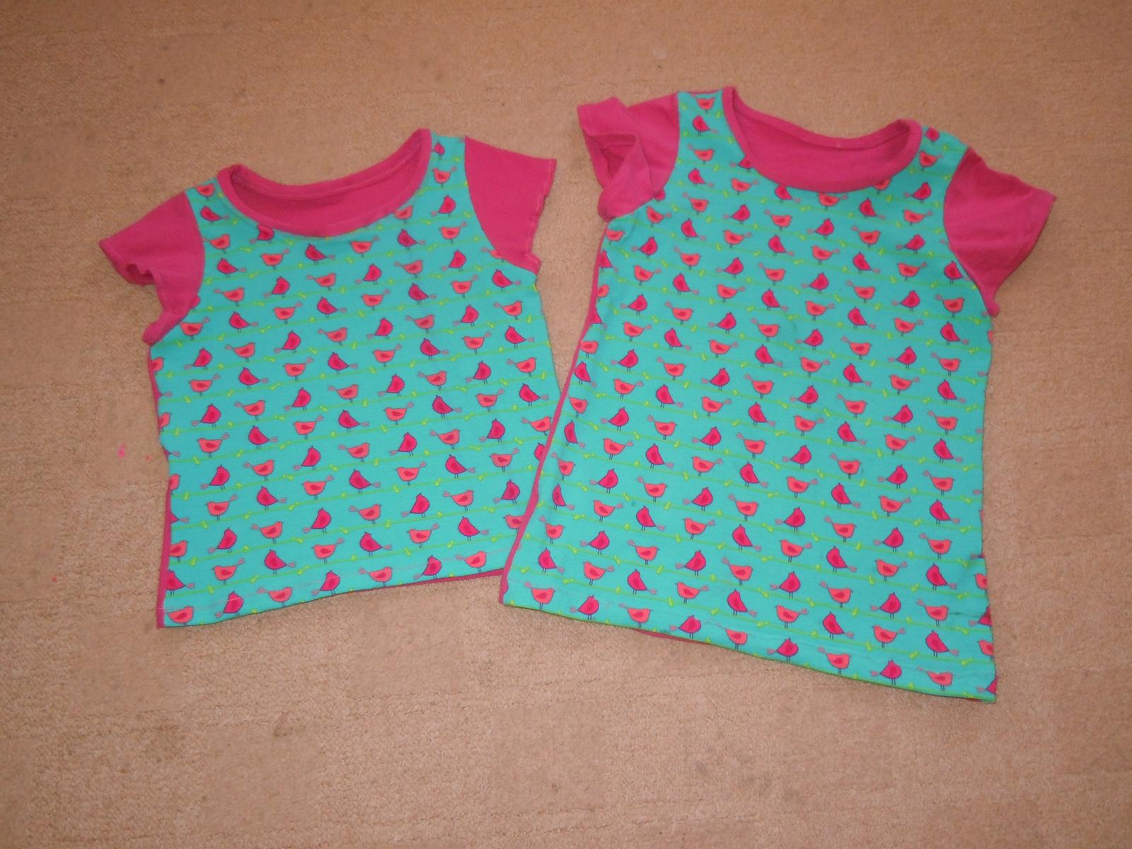 No a zkoušela jsem trička ušít z jedné velikosti, starší má 110 a mladší 92. Udělala jsem střih 110, starší jsem to střihla s přídavkama a mladší bez, ale mladší má dost velký výstřih a průramky, takže tam jsem měla ubrat.
