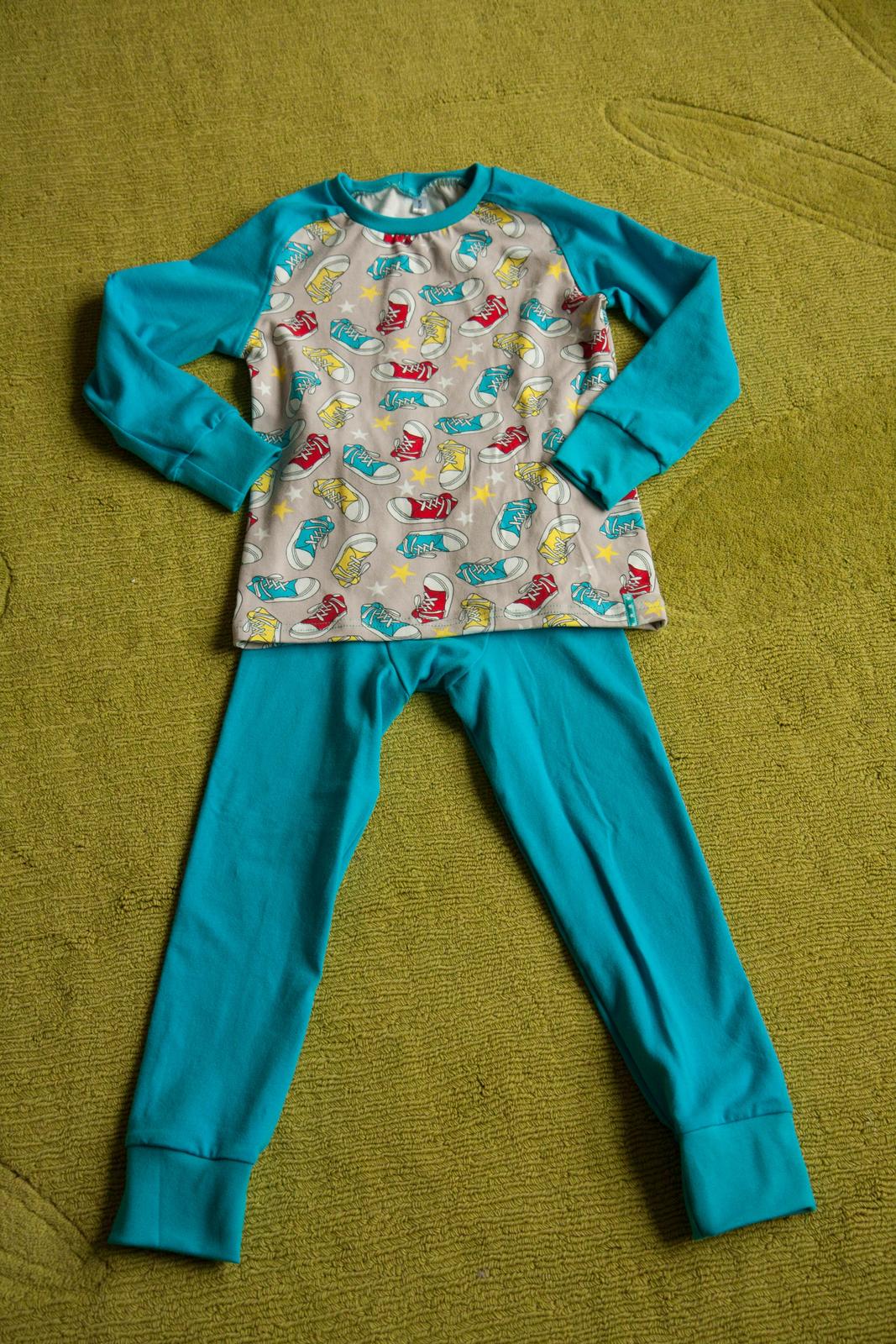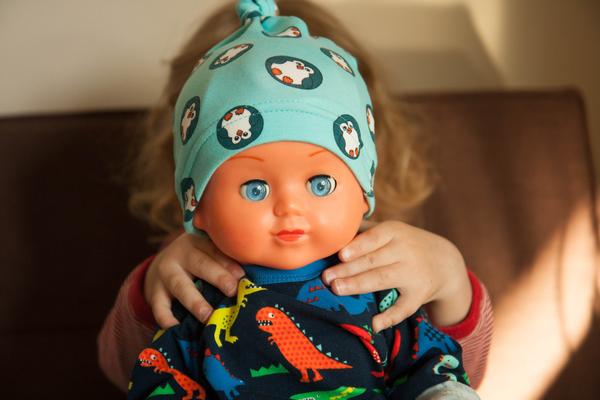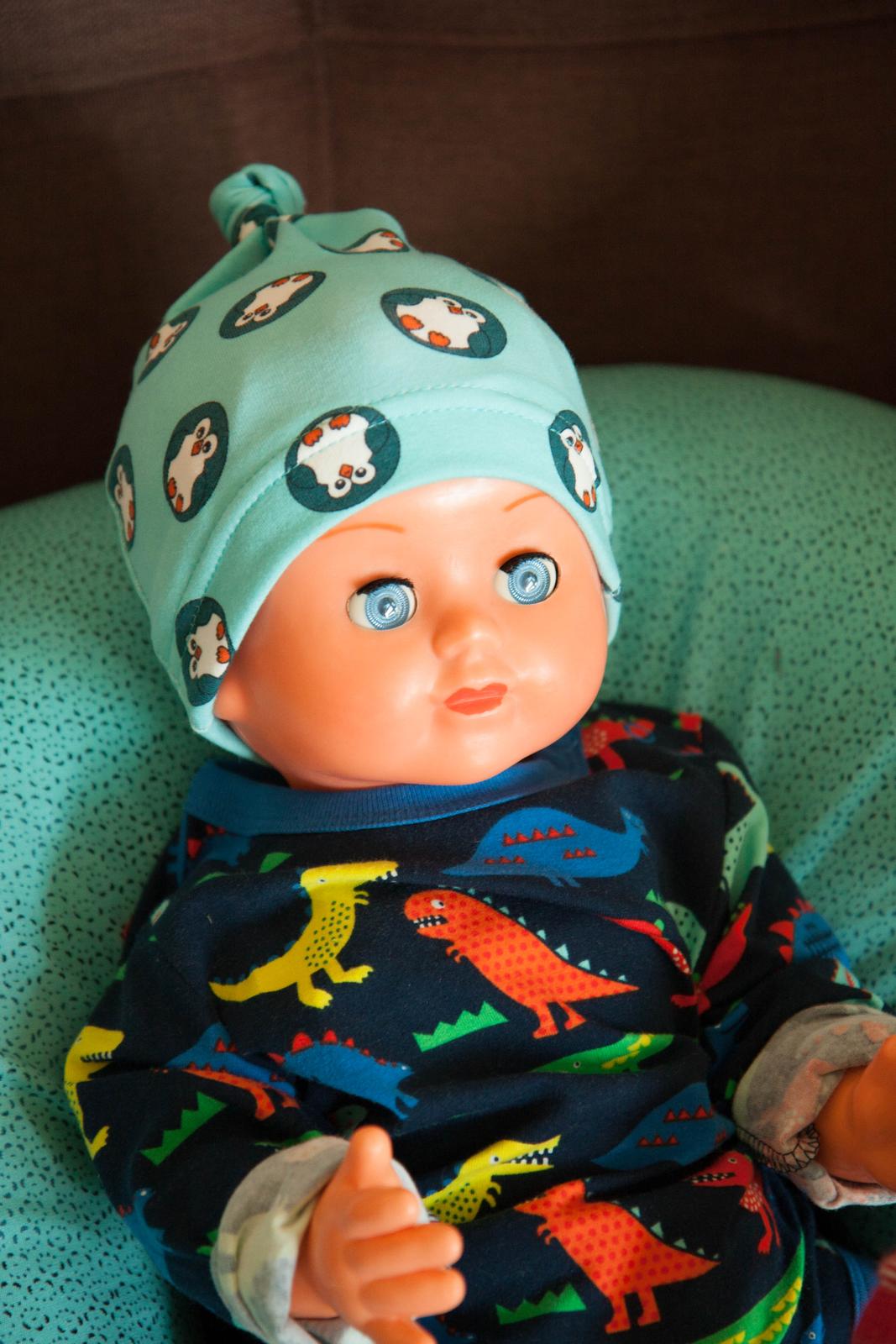 Pár rychlých výcvaků s polštářem, pyžamo včera došité a dneska donesené do školky, opravdu jsme měli pyžamovou krizi, a čepička pro miminko ala Terezita z posledního zbytku tučňáků.