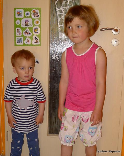 Tak včerejší kousky pro nás - Jola plátěné kraťasy a bambus tílko, Jáša mi zabavil tričko se žralokem, to moje tričko fotila J. takže trochu z podhledu, hlavu s milionem brad jsem musela oříznout 😀