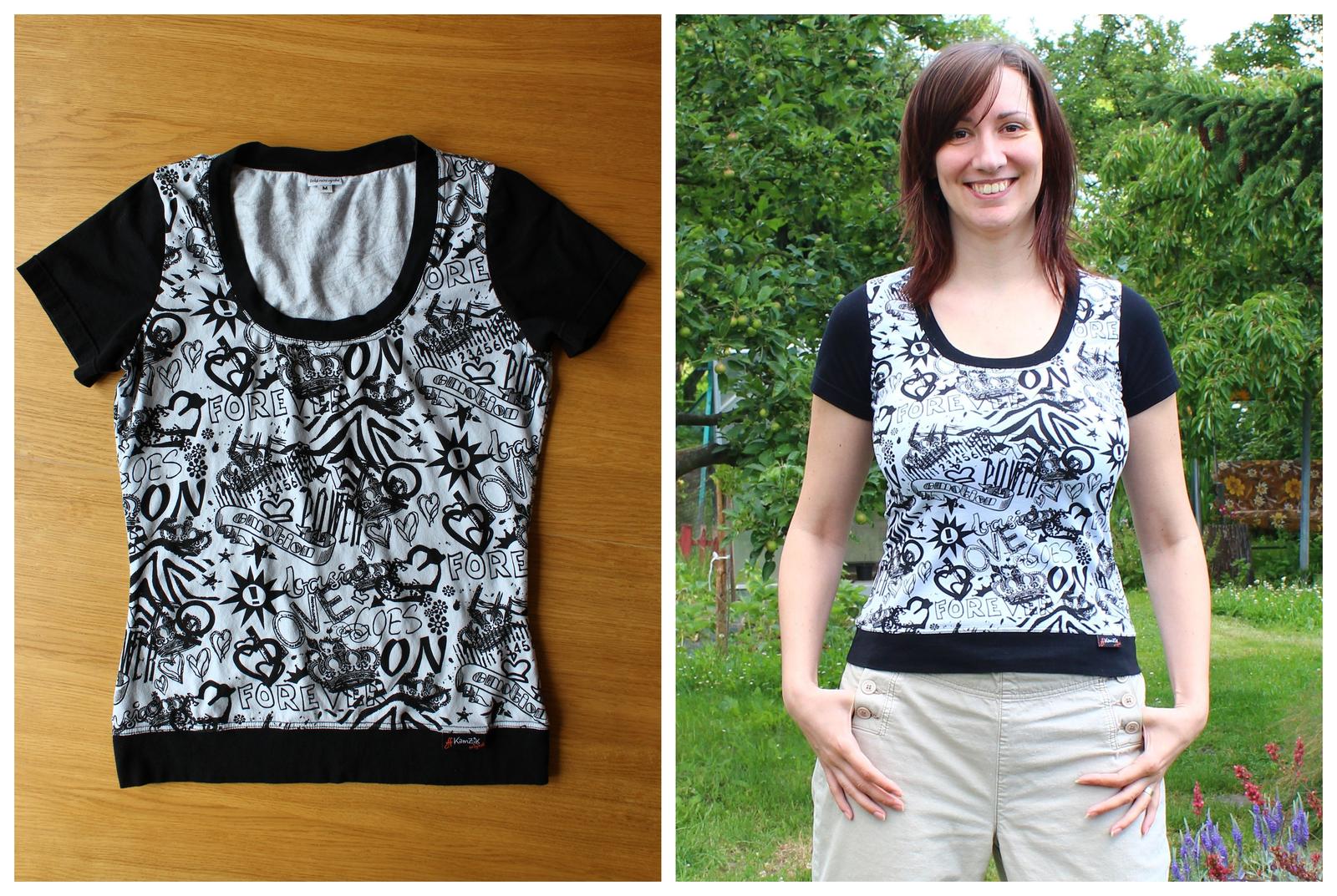 šedočerné je první triko podle mého zkonstruovaného střihu... střih byl spočítaný pro látky s roztažností cca 10-30% a ta látka byla dle mého odhadu někde kolem těch 10%, tak je na mě dost naknap a bohužel tím pádem mu to sebralo i na délce o něco... necítím se v něm úplně nejlíp 😒