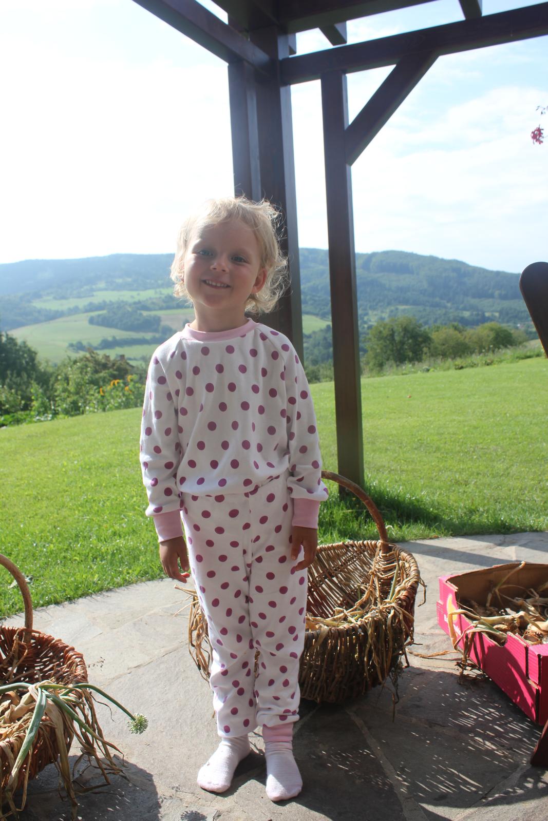 a pyzamo (to je tiez dobry gulickovy leziak :D ) , ale teda daleko od domu sa jej nechcelo a ani inde sa postavit, som rada ze sa aspon pousmiala .. :( po tom grcani je slaba ako mucha..