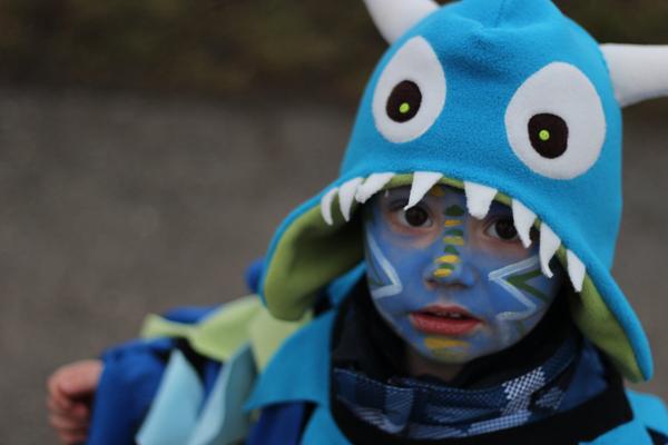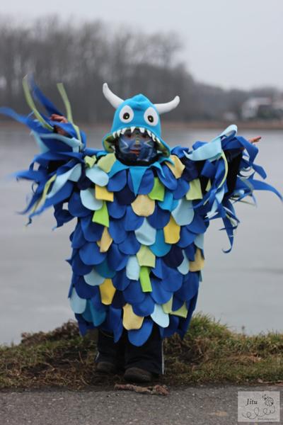 Přispěju do diskuse o maskách a kostýmech na karneval - moje letošní modrá příšera (zadání - chci modrou příšeru se šupinama, peřím, drápama, zubama a rohama). drápy už jsem nestihla, čepici jsem dodělávala 20 minut před odchodem na průvod. A je to na ní bohužel vidět, nechtěla jsem lovit střih, štřihla jsem tedy od oka a nesedí, je hrbatá. bohužel je aktuálně nejoblíbenější, tak ji musím rozpárat a upravit. Takhle mi hanba fackuje při každém pohledu na ni.