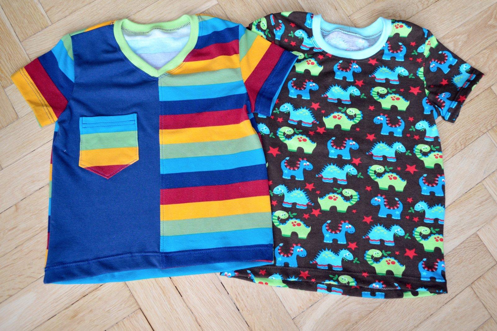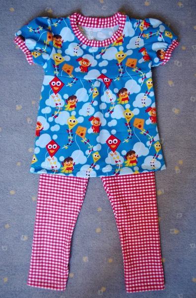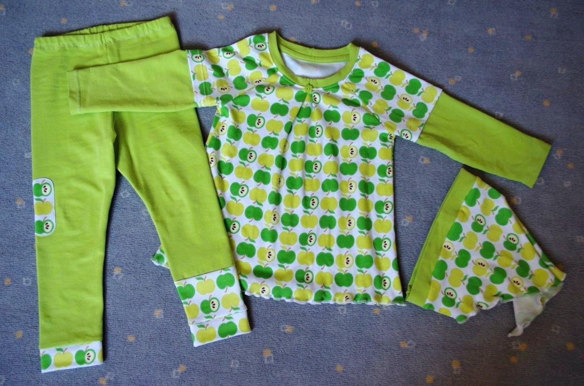 Šila jsem něco málo pro dcerku, ale tentorkát to bylo spíš na ostudu. Na zelené soupravě jsem zkazila, co se dalo. Nejdřív jsem si střihla 2x stejnou nohavici na legíny, pak už jsem neměla dost délky, takže jedna nohavice je nadstavená. Na tunice jsem udělala velký výstřih jak na sebe, všechno začistila, prošila a až pak mi to došlo. Měla jsem strach, že látka už by mohla být rozsekaná, proto jsem to nechtěla párat, takže jsem vepředu vymyslela sklad, aby to bylo aspoň nositelné. A stejně je jí to ještě docela velké, bude to asi až na podzim. Dráčková souprava aspoň vyšla dle mých představ.