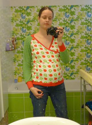 Aby se tu dnes nebohá Caramilla neztrapňovala sama se svým pyžamem, hodím svůj skvělý autoportrét v novém kojitričku. Od včerejška doznalo jistých změn v lemu výstřihu, za krkem jsem to udělala širší, takže teď už mi to nepadá z ramen (napoprvé jsem to blbě promyslela a vypočítala a uřízla lem moc úzký). Na fotce je též možno pozorovat naše úžasně čisté zrcadlo v koupelně 😀 A takhle zelenou barvu obvykle nemám, to jen ty kachličky nějak oblbly foťák a nepodařilo se mi barvy moc vyladit.