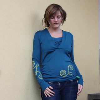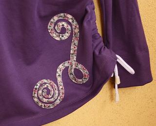 Aplikace na mikinu jsem dělala rovným proužkem přeskládaným a prošitým, na tričko jsem podžehlila oboustr. vlizelinem (nemám vliesofix, zatím...) a namalovala jsem si ty spirálky, pak je vystřihla, nažehlila na triko a našila. Ale je to dost piplačka, našívat spirálky, člověk furt dokola jak blbec točí tím trikem 😀
