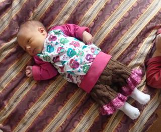 Tak modelka poprvé v látkovce, vlňákách a tričku 🙂 Musím teda říct, že jsem ty trička dobře vymyslela, jsou krásně dlouhá a dole obtažená, takže jí sedí hezky přes zadek, vůbec se to nevyhrnuje a tudíž není problém, že nemá bodýčko.