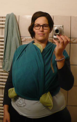 Hlásím, že jsme byla s Báškem poprvé venku s šátkem... Zatímco normálně si natočí hlavu na stranu, tak teď ji neomylně zabořil mezi prsa, takže jsem celou dobu přemýšlela, jestli se mi tam neudusí... naštěstí to přežil (uklidňovalo mně vědomí, že pokud se nedusí při kojení, měl by tohle zvládnout taky). Ve vázání jsem zatím samouk, ale snad to nebylo úplně špatně umotaný...