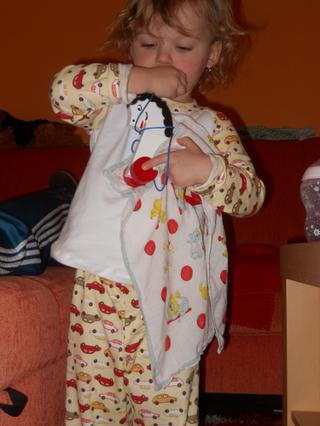 merino vestička čo som ušila zo zbytku sa osvedčila na doma keď dietko pije z pohárika a sem tam sa ešte jemne obleje, merino to pekne zachytí 🙂 a konečne nevytŕča tričko a kríže z teplákov 😉