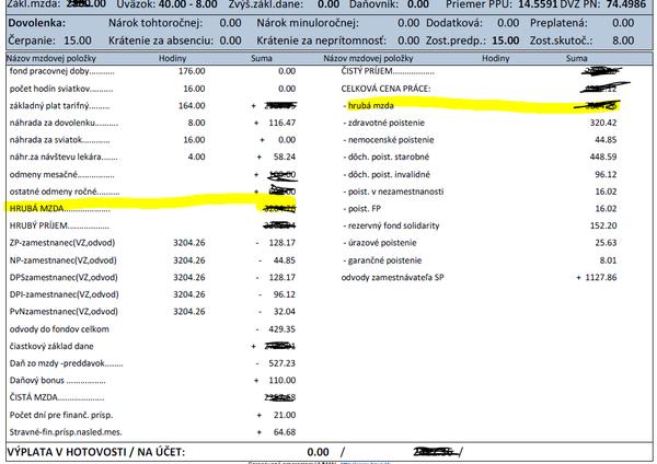 To tam máš len 2 riadky? Ja mám v hornej časti pásky uvedené “Základná mzda”, čo je vlastne suma, ktorú mám aj v pracovnej zmluve ako mesačnú hrubú mzdu. A potom nižšie, v rozpise koľko išlo na dane, poistenia atď je “Hrubá mzda”, to už je za konkrétny mesiac, a môže byť vyššia či nižšia než tá základná mzda, podľa toho, či som dostala za ten mesiac nejaké odmeny/príplatky, alebo bola na PN atď.