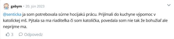 Ak je náplň práce kuchárky uvariť obed, nabrať ho deťom na tanier a umyť riad, nemajú čo zisťovať jej náboženstvo. Počas toho keď sa dozor v jedálni/učiteľka s deťmi modlí pred jedlom bude v tichosti stáť, zamestnávateľa do toho je nič.