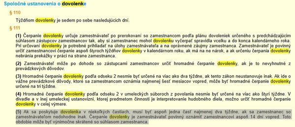 (5) Ak sa poskytuje dovolenka v niekoľkých častiach, musí byť aspoň jedna časť najmenej dva týždne, ak sa zamestnanec so zamestnávateľom nedohodne inak. Čerpanie dovolenky je zamestnávateľ povinný oznámiť zamestnancovi aspoň 14 dní vopred. Toto obdobie môže byť výnimočne skrátené so súhlasom zamestnanca.