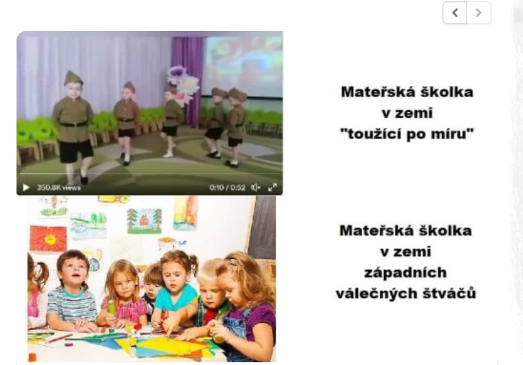 Takže tebe príde spojenie zbrane a deti ako hlúposť, presne tak ako veľkej časti rodičov na západe (a tu myslím pod západom celú západnú civilizáciu vrátane strednej Európy), ale máš potrebu obhajovať ruských škôlkarov oblečených za vojakov, lebo je to vraj lepšie ako to, čo si nazvala západom.