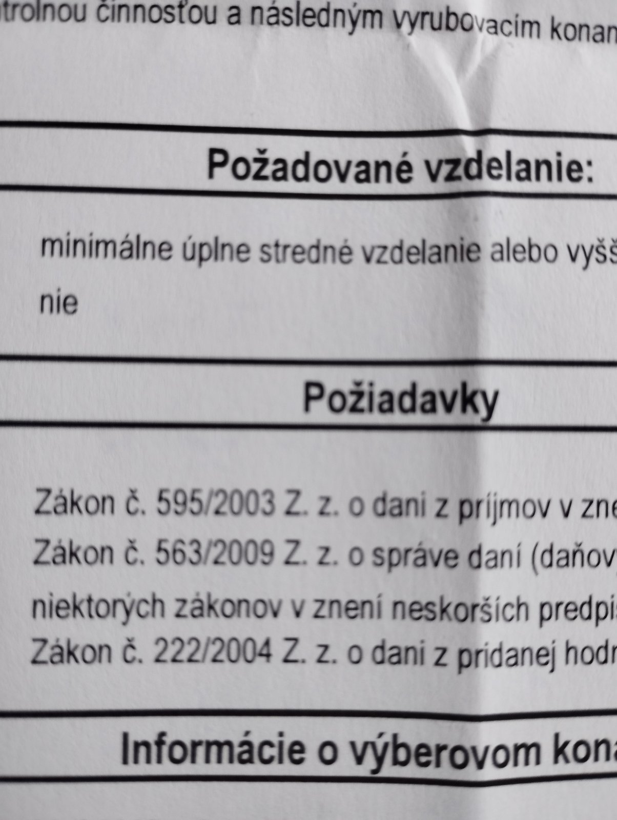Ahojte, zaujal ma inzerát na prácu kontrolóra na daňovom úrade. Treba si na pohovor naštudovať tieto zákony. Pracujete niekto na tejto pozícii? Je šanca sa tam dostať bez praxe s daňami? Teda tieto tri zákony sa pokúsim naštudovať, ale či teda sa dá komplet na tu prácu naučiť ako úplný nováčik alebo je prekážka, že v tejto sfére som doteraz nepracovala... Ďakujem za každú radu