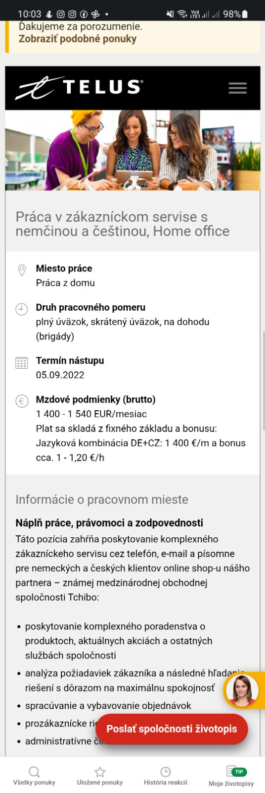 Práca v zákazníckom servise s nemčinou a češtinou, Home office Telus