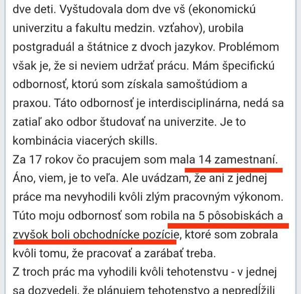 Za 17 rokov čo pracujem som mala 14 zamestnaní. Áno, viem, je to veľa. Ale uvádzam, že ani z jednej práce ma nevyhodili kvôli zlým pracovným výkonom. Túto moju odbornosť som robila na 5 pôsobiskách a zvyšok boli obchodnícke pozície, ktoré som zobrala kvôli tomu, že pracovať a zarábať treba.