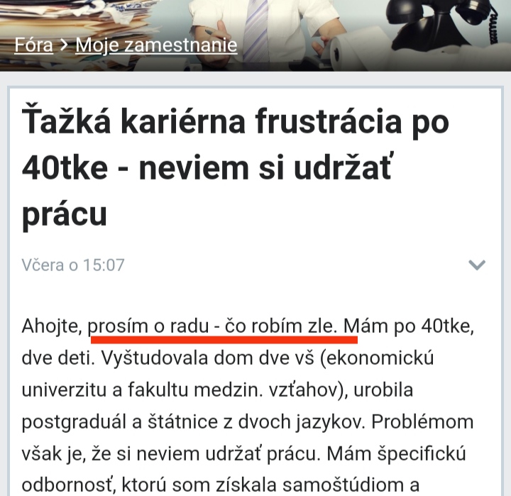 Ahojte, prosím o radu - čo robím zle. Mám po 40tke, dve deti. Vyštudovala dom dve vš (ekonomickú univerzitu a fakultu medzin. vzťahov), urobila postgraduál a štátnice z dvoch jazykov. Problémom však je, že si neviem udržať prácu. Mám špecifickú odbornosť, ktorú som získala samoštúdiom a praxou. Táto odbornosť je interdisciplinárna, nedá sa zatiaľ ako odbor študovať na univerzite. Je to kombinácia viacerých skills.
